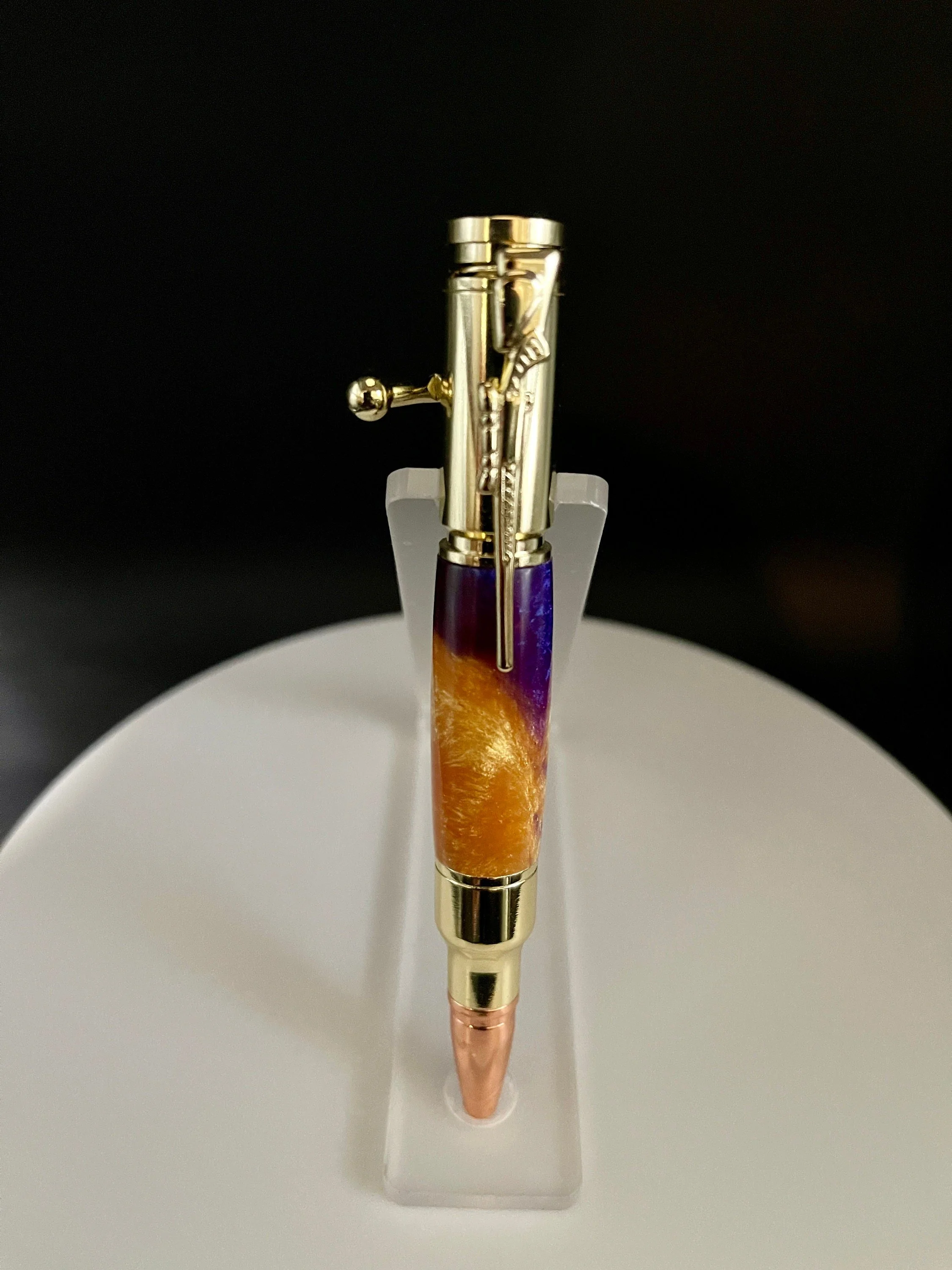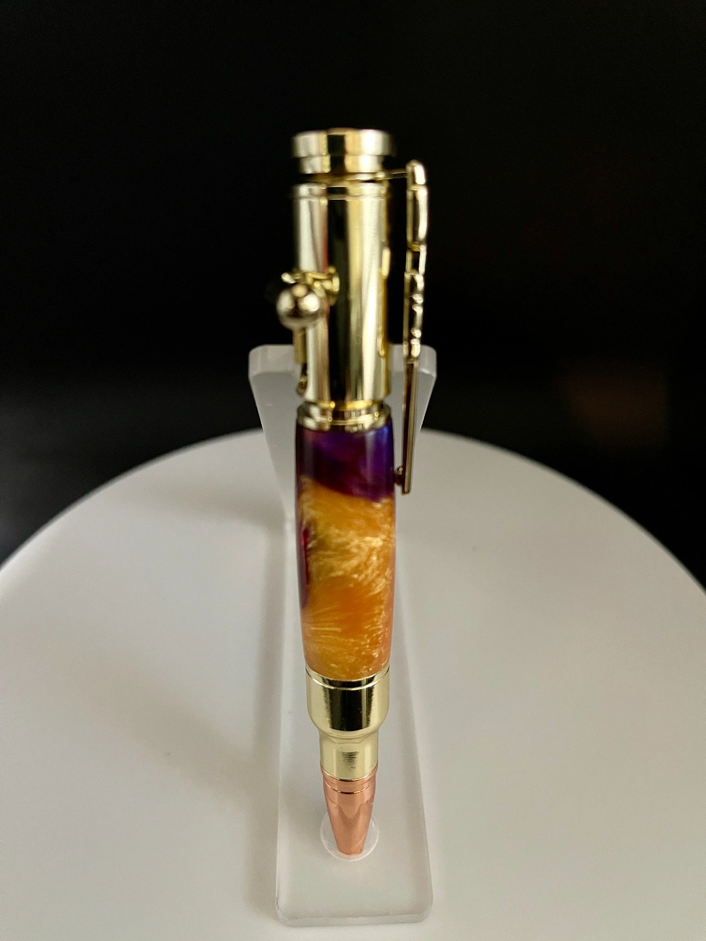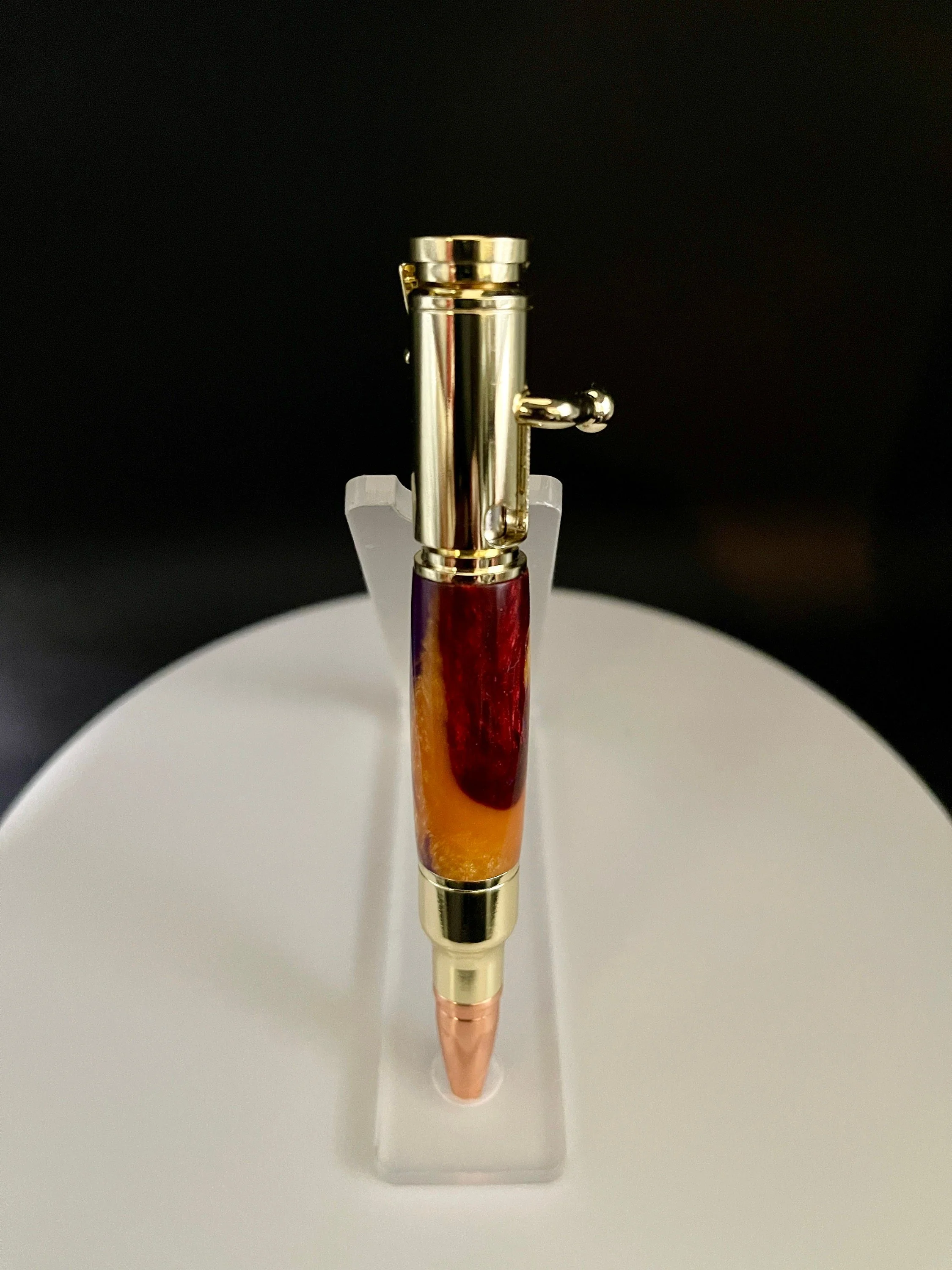 A fun Bolt Action pen that will be hard for any hunting or target-shooting enthusiast to put down. The realistic bolt-action handle smoothly advances and retracts to securely lock the refill in place. Includes a bolt action rifle clip and a replica 30 caliber cartridge and rose gold bullet tip for added authenticity. Smaller than a normal pen. Uses a Parker Refill. Makes for a wonderful Valentine's gift, Christmas Gift, Birthday gift, Wedding Gift(GroomsMen), Custom Gift, One of a Kind gift, Retirement gift, Mother's Day gift, Father's Day gift.