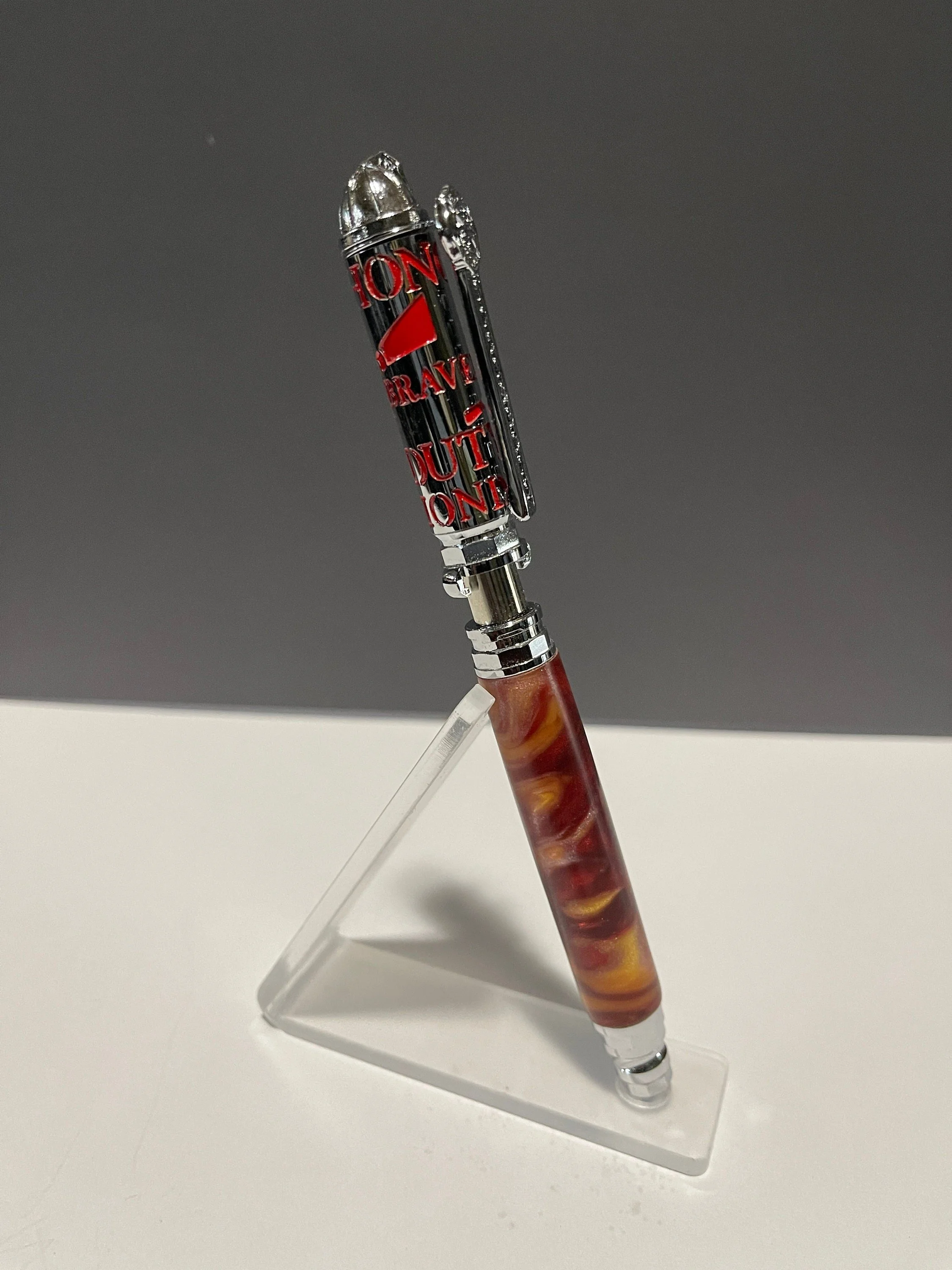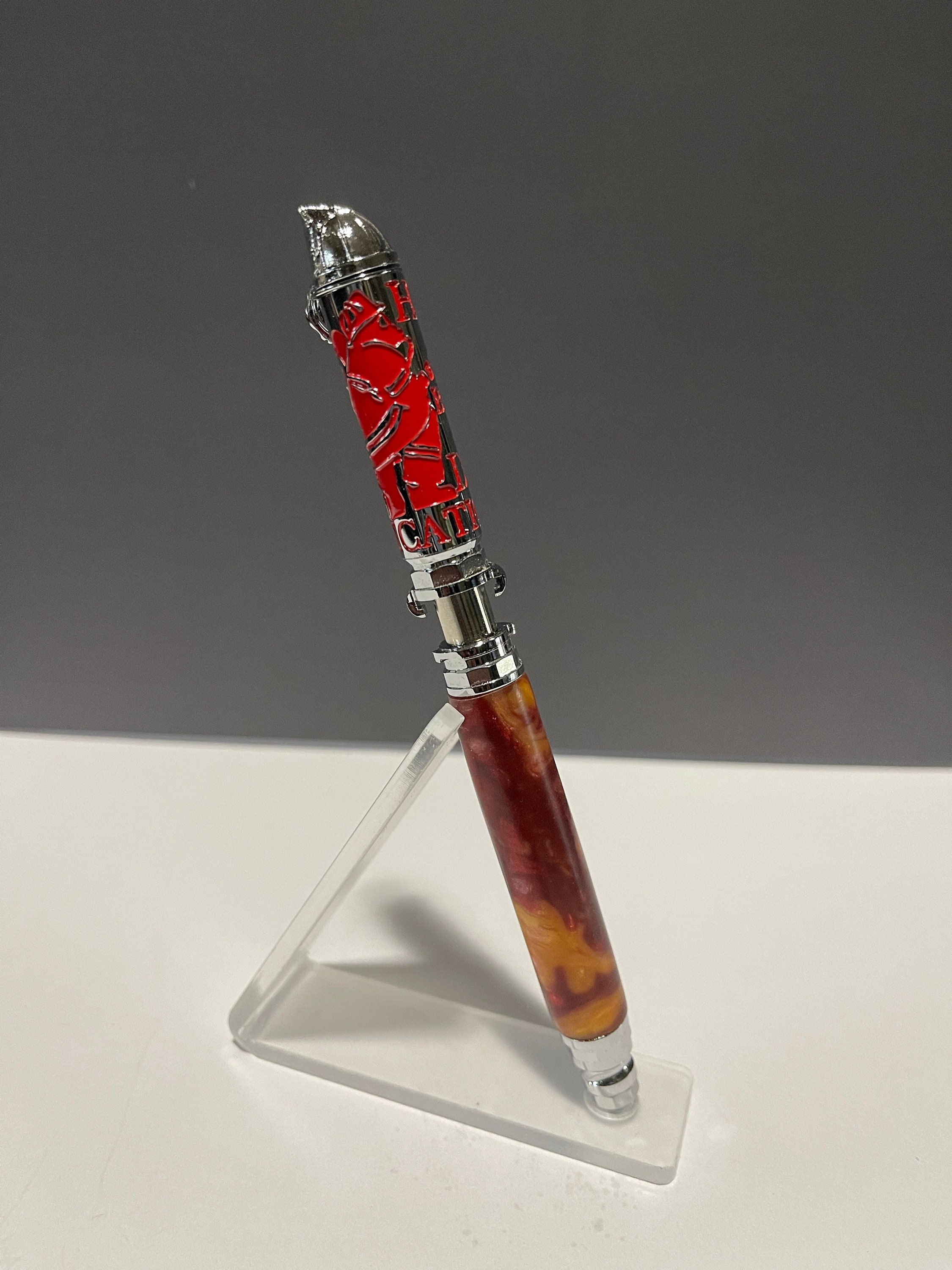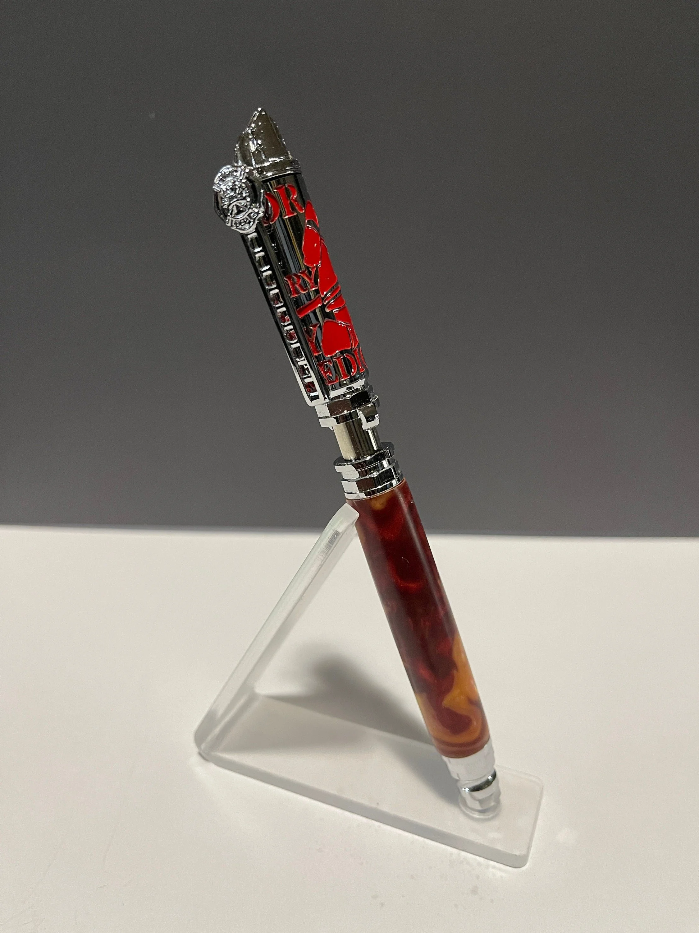 Unique hand-turned Resin Pen. Pen Clip: Represents a Firefighter's ladder. At the top of the clip is a variation of the iconic Firefighter's Maltese Cross widely used across fire departments as a symbol of protection and a badge of honor. Pen End: Depicts a silhouette of a Firefighter in uniform at work - braced on the ground in the act of holding the hose. The design has the look of laser-cut sheet metal revealing a layer of enameled red or yellow metal through the silhouette. In addition, the words "Honor" "Bravery" "Duty" and "Dedication" are displayed behind the silhouette to further recognize a firefighter's heroism. Pen Top: Features a classic and recognizable Firefighter's helmet form. Pen Tip: Shaped from Firefighter's hose-nozzles throughout history, touching on past and present forms. "Push and Lock" Pen Mechanism: Emulates an American fire hose adapter that connects fire hoses to water sources including a firefighter's truck. To extend the refill, simply push the back-end of the pen downward and rotate to lock the upper adapter clips into place. The tip hose-nozzle extends simultaneously with the pen refill as a reference to the water rushing out of the hose. Includes a smooth writing Parker style refill.