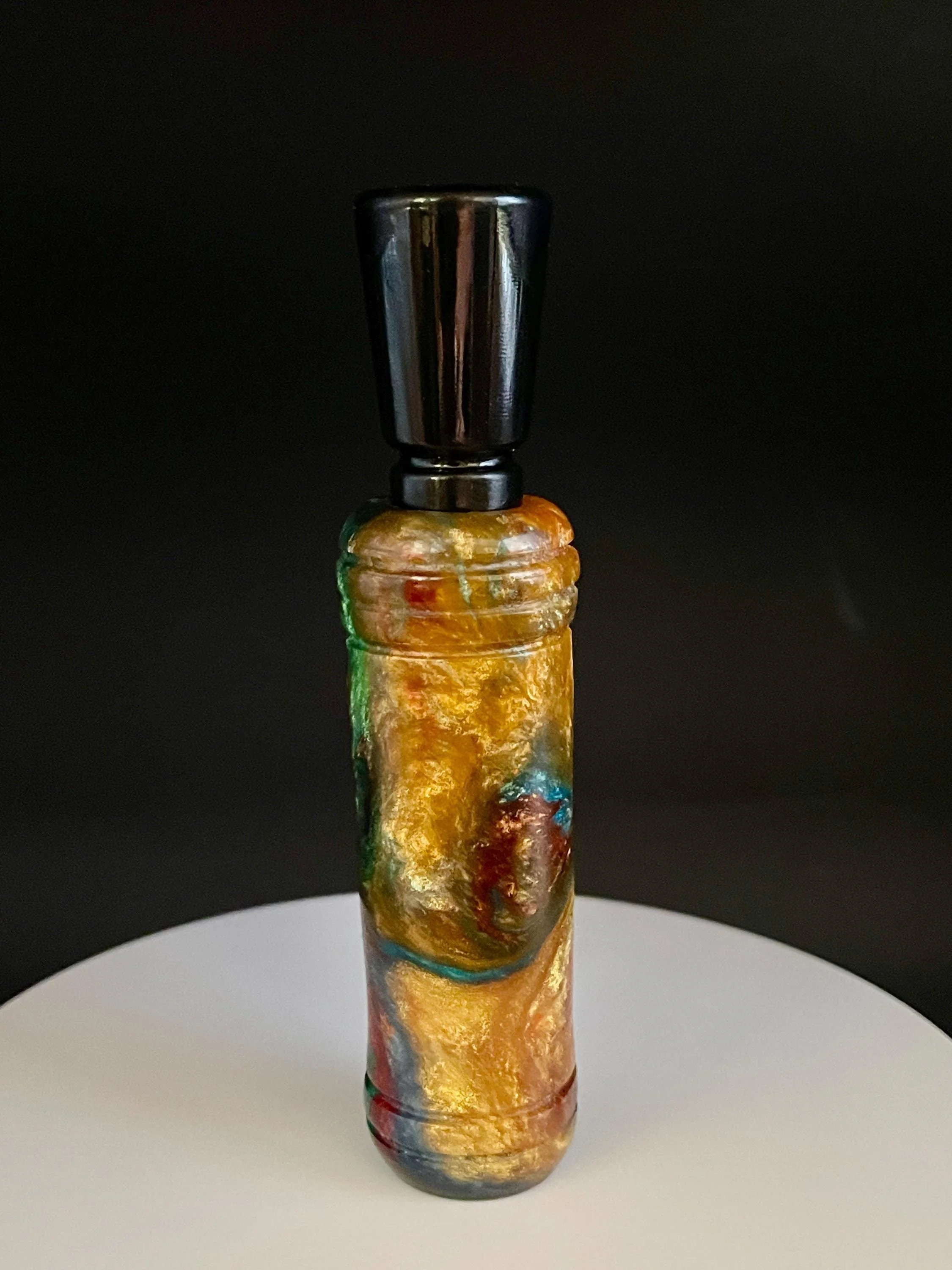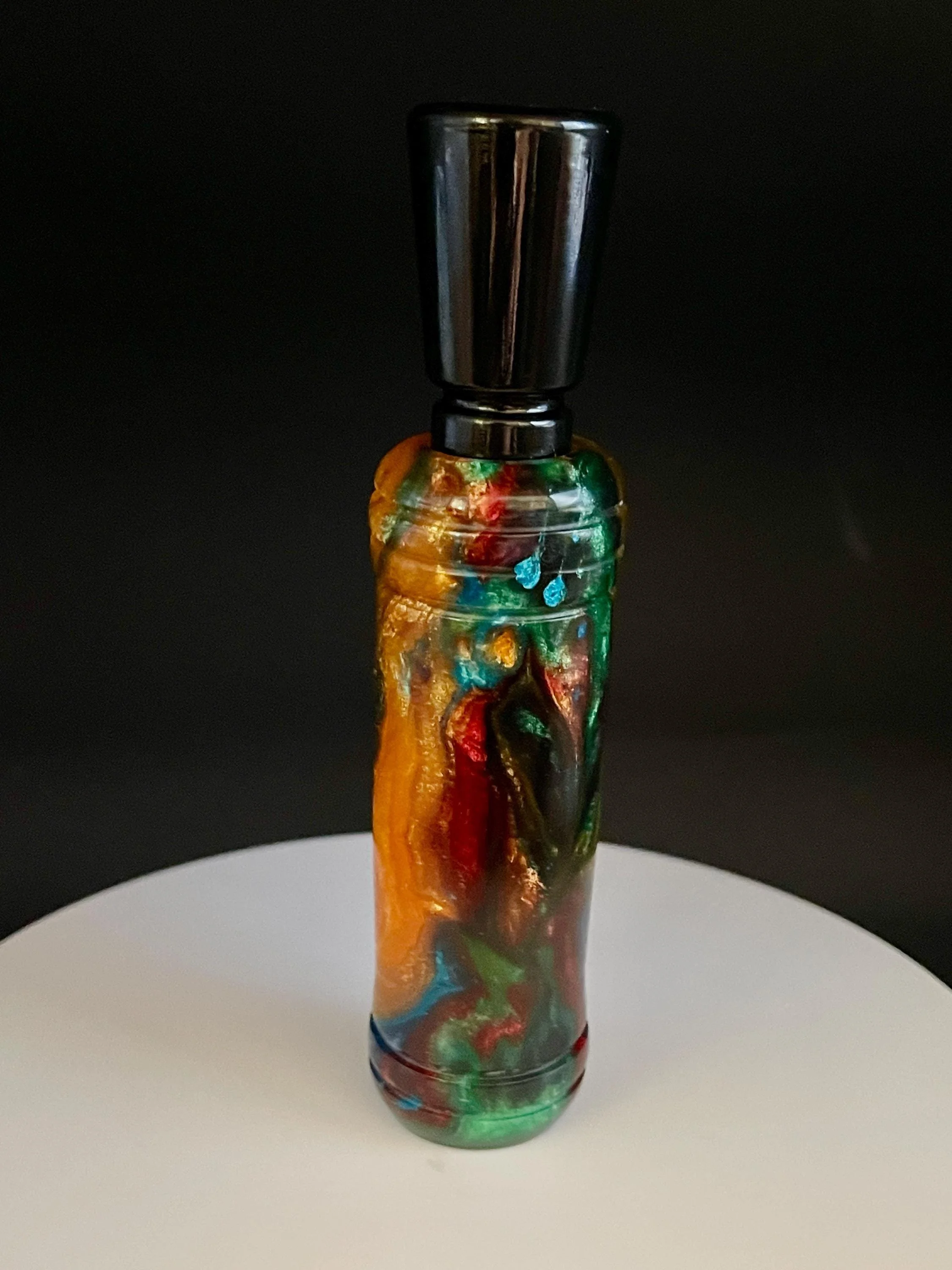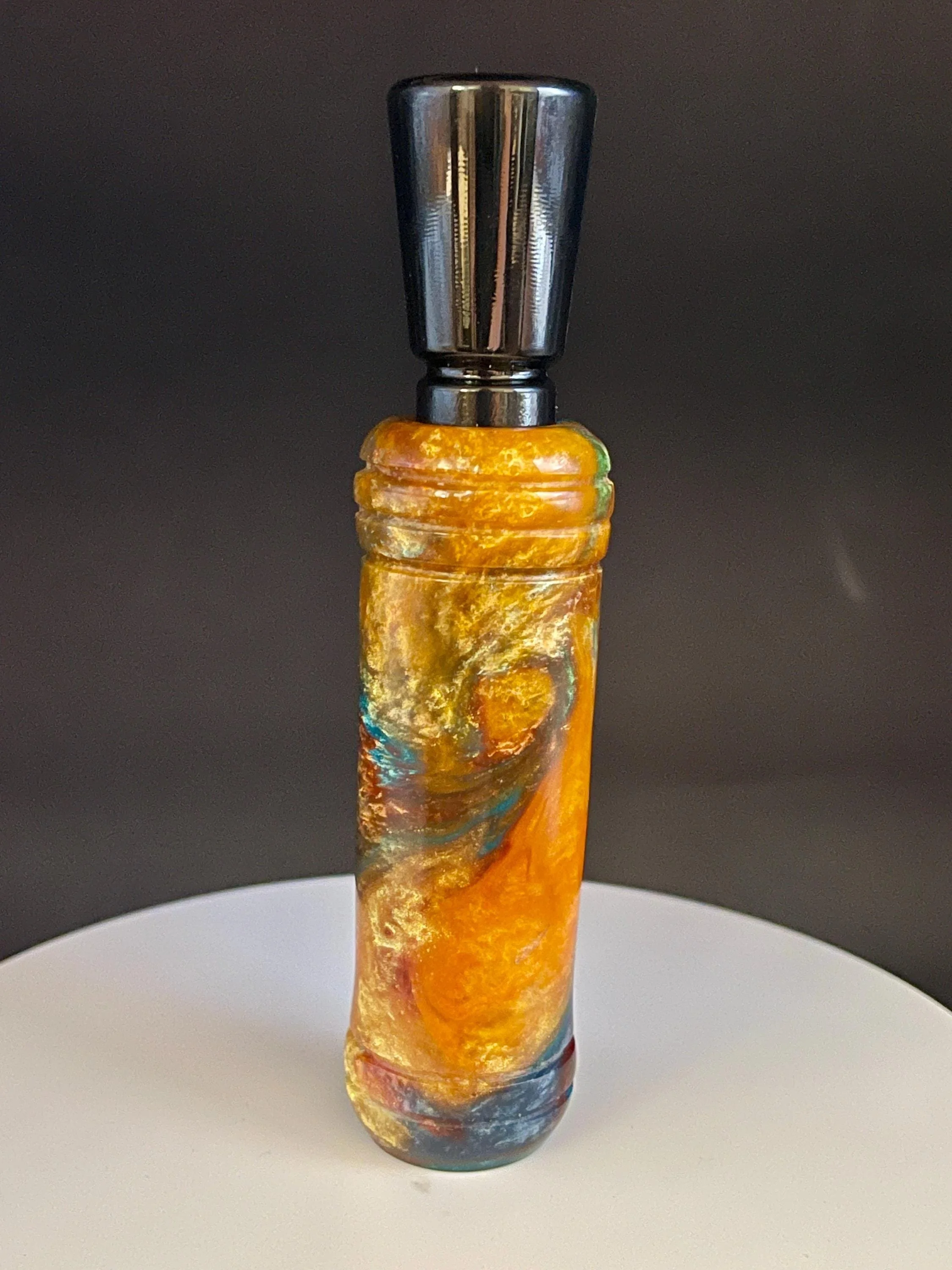 Hand crafted resin duck call that is so easy to use that you will sound like a flock of mallards ranging from high up to a feeding call. This double reed duck call requires more air to blow and doesn't have as much range as a single-reed duck call, however they have a "sweet spot" that sounds more realistic to passing ducks.
