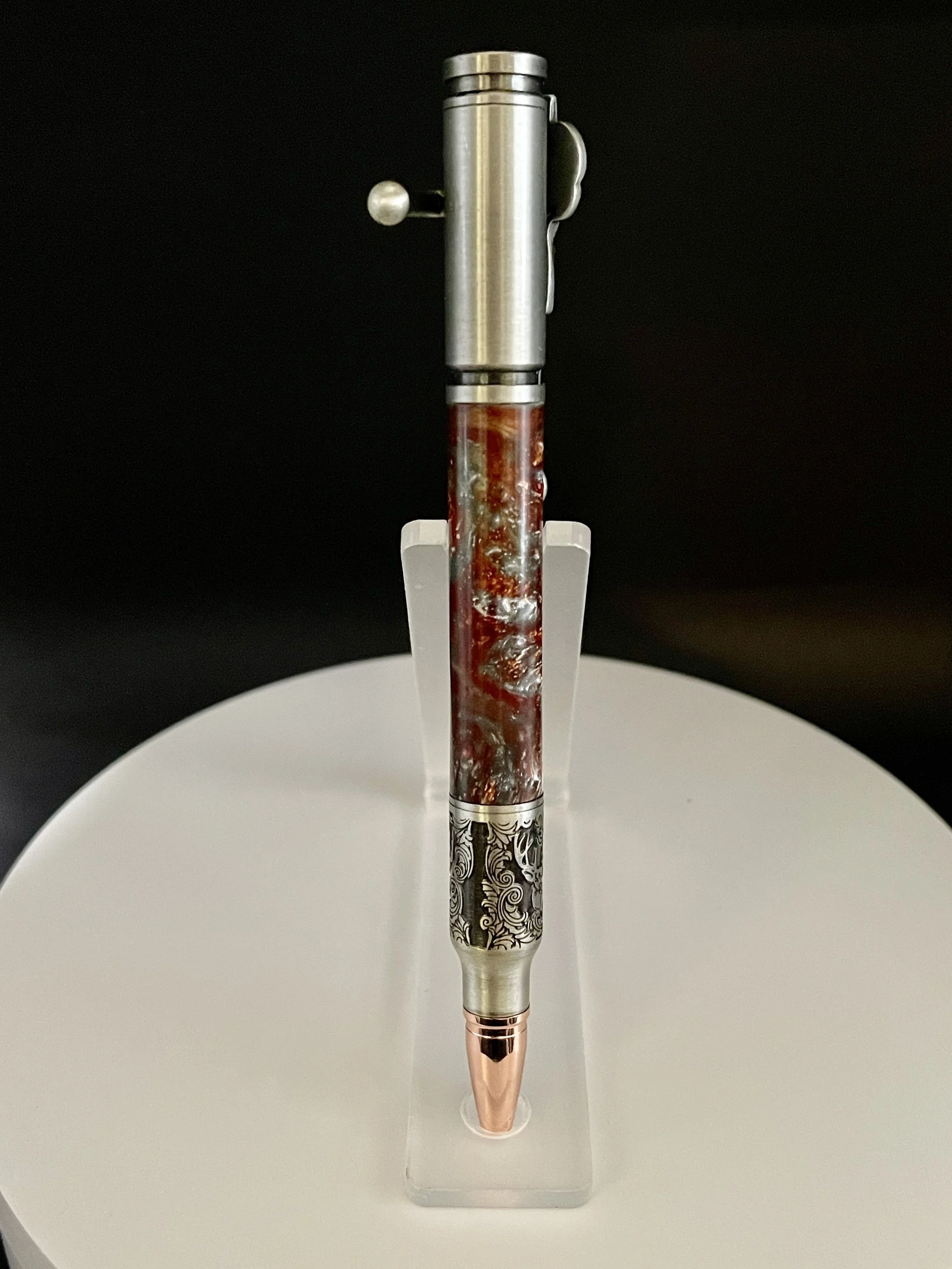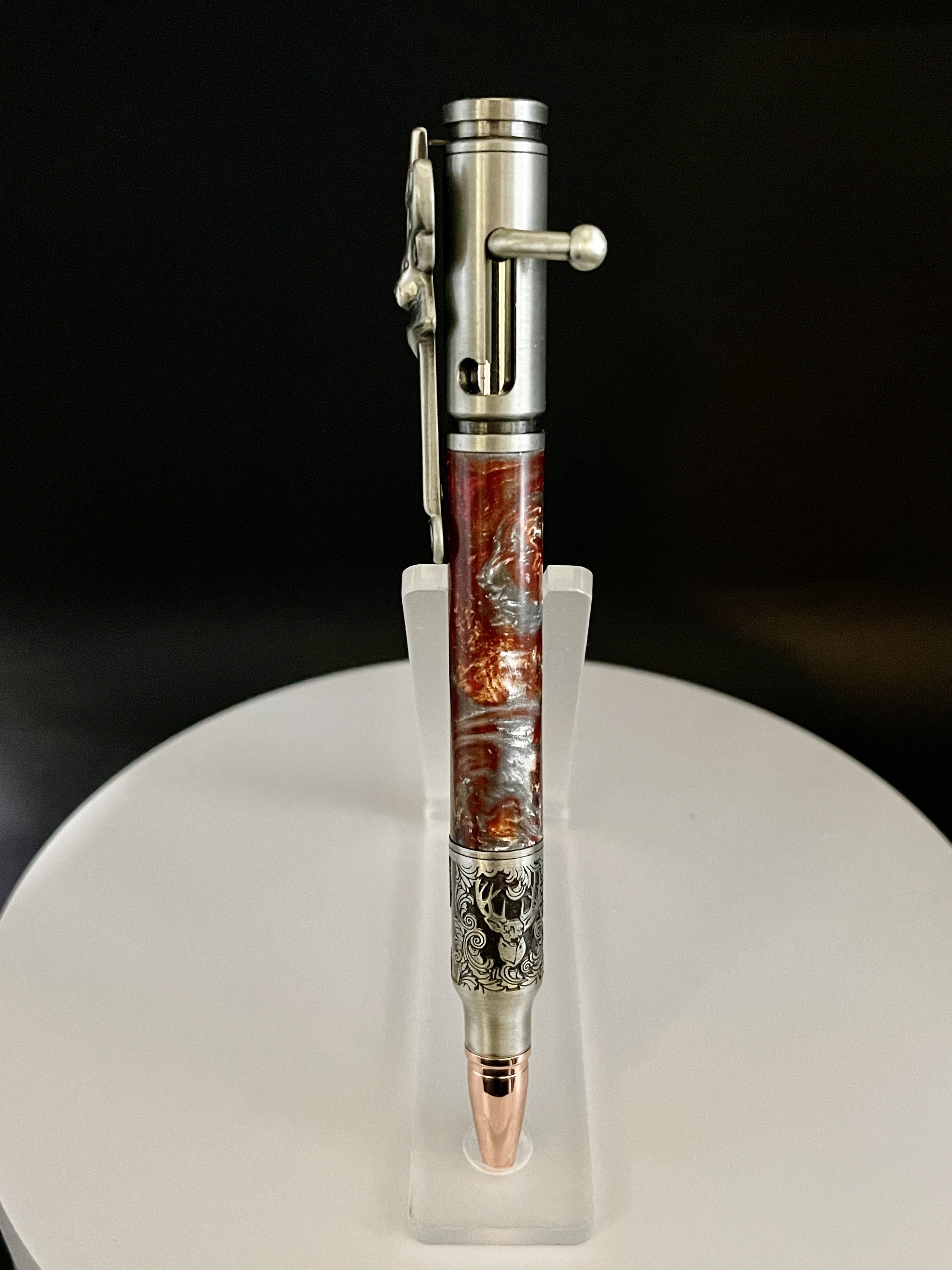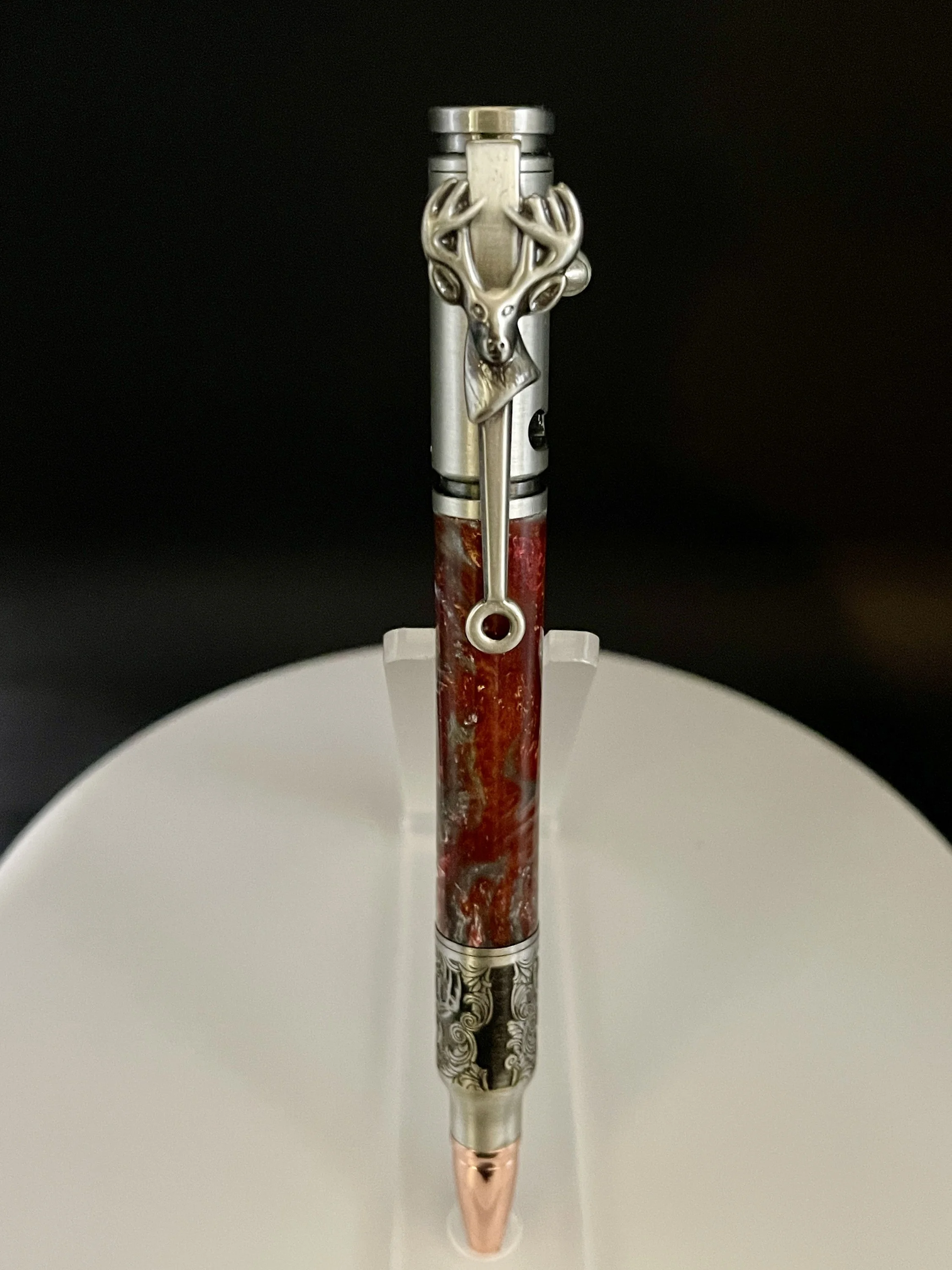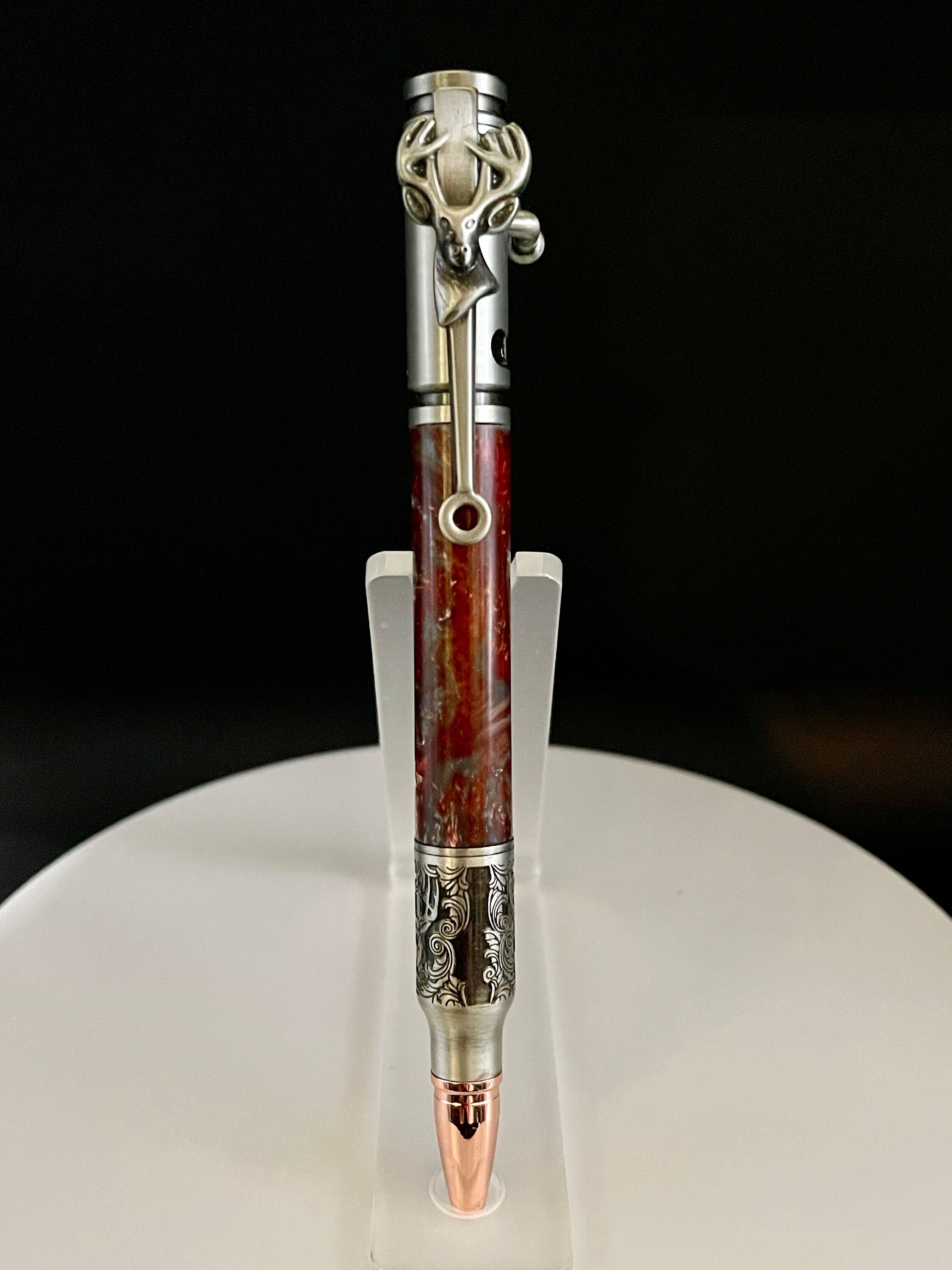 A pen for that deer-hunting enthusiast. The pen tip features a relief cut scroll engraving of an authentic trophy deer mount. Makes for a wonderful Valentine's gift, Christmas Gift, Birthday gift, Wedding Gift(GroomsMen), Custom Gift, One of a Kind gift, retirement gift, Mother's Day gift, Father's Day gift.