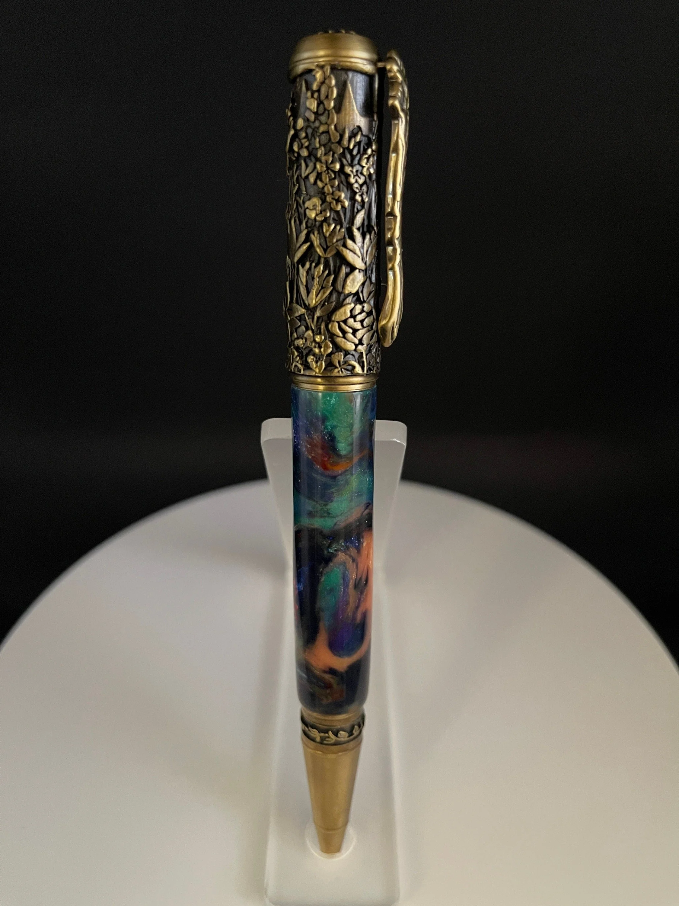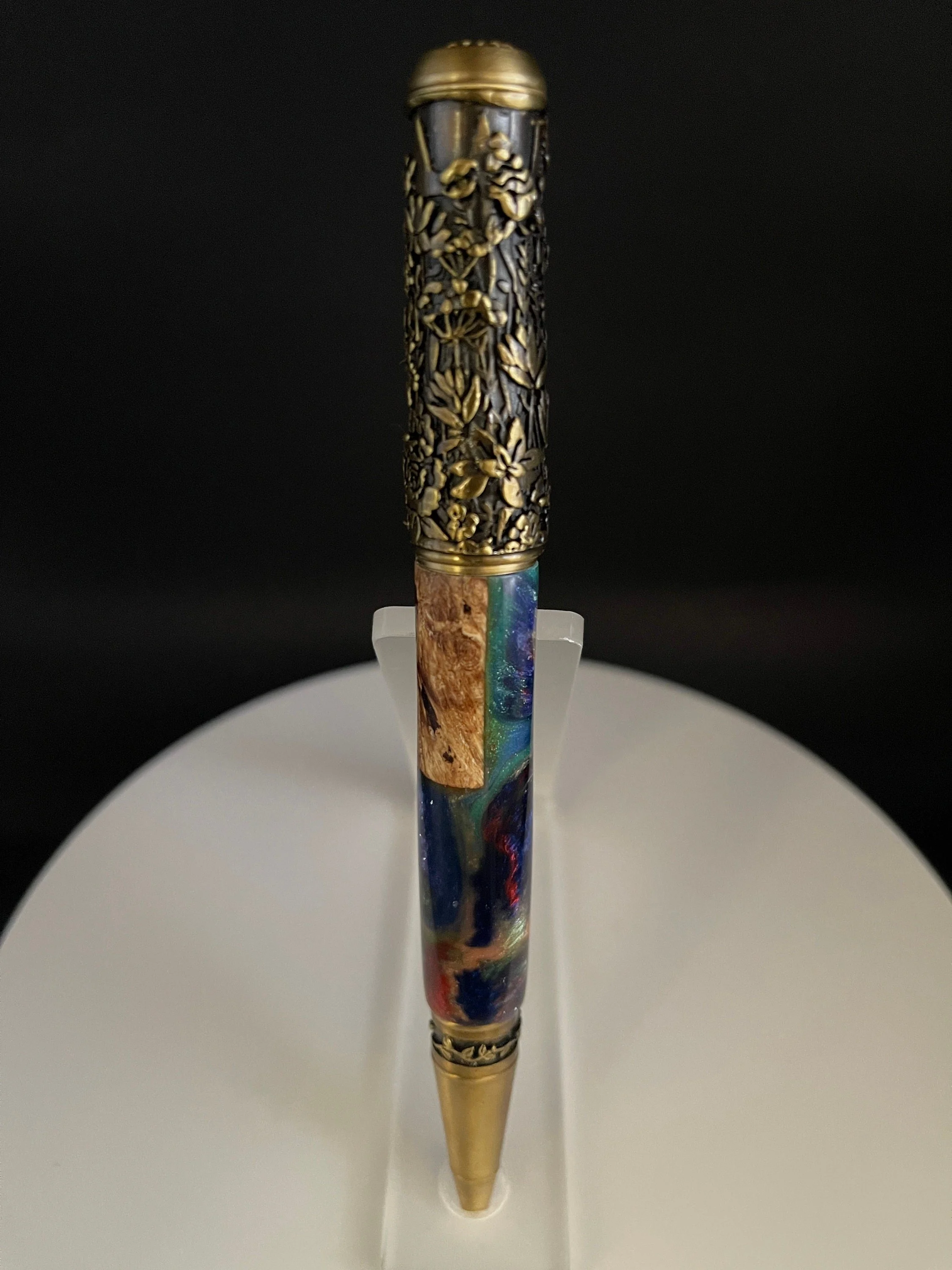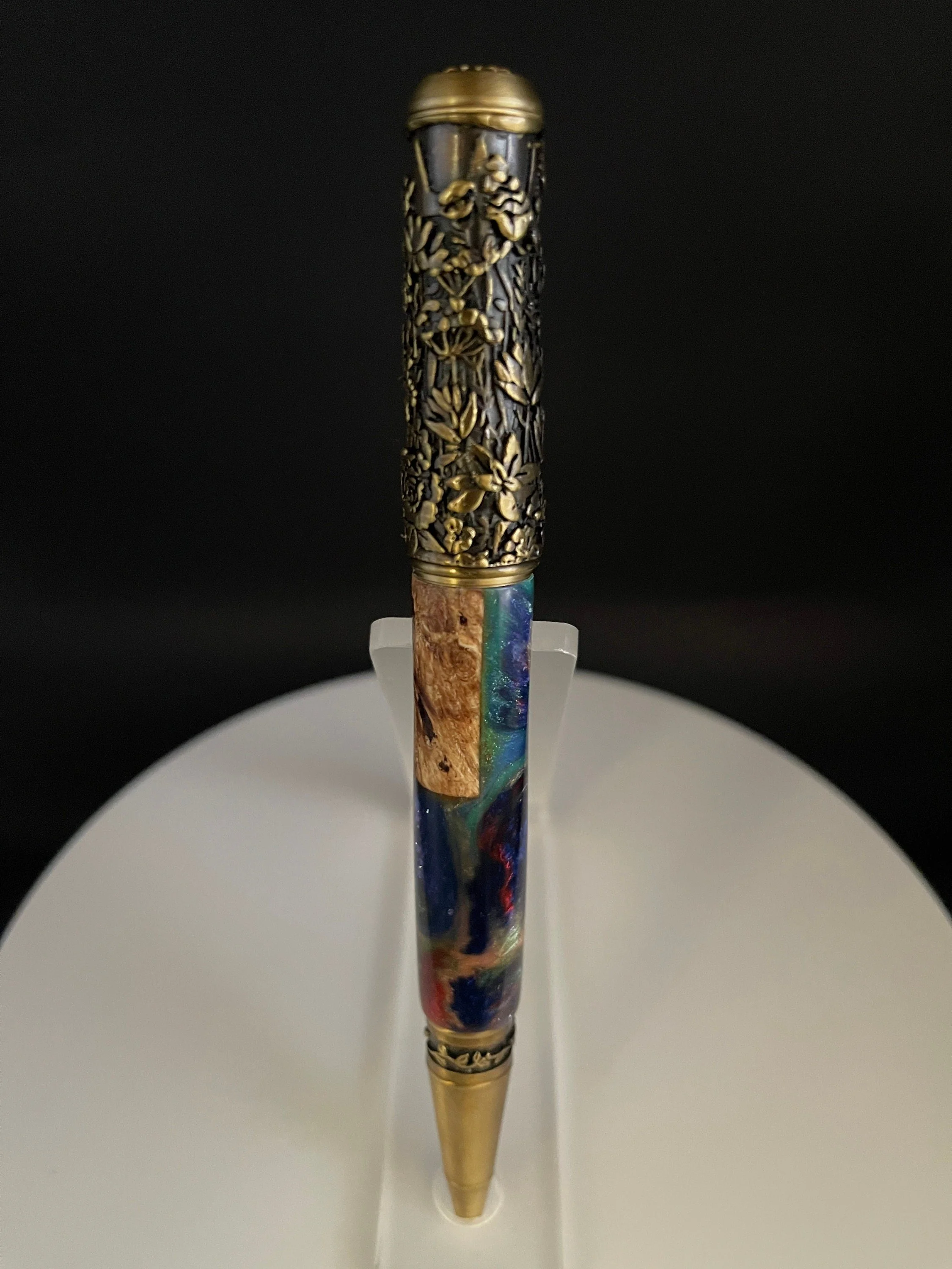 Unique hand-turned Resin with Walnut Pen. A Pen for lovers of flowers and all things botanical. The design combines a variety of natural elements from gardens and wildflowers as if growing from the pen itself to create the ultimate celebration of the botanical world around us. Exquisitely casted in intricate detail. On the pen end you will find wildflowers and grasses, with bugs and butterflies mixed within. The pen clip overlays the backend with similar flowers as if to pop-out from the pen end. The pen top includes a bursting bloom while the pen tip's wondering vine band adds another charming layer to the pen. Includes a smooth writing Parker style refill.