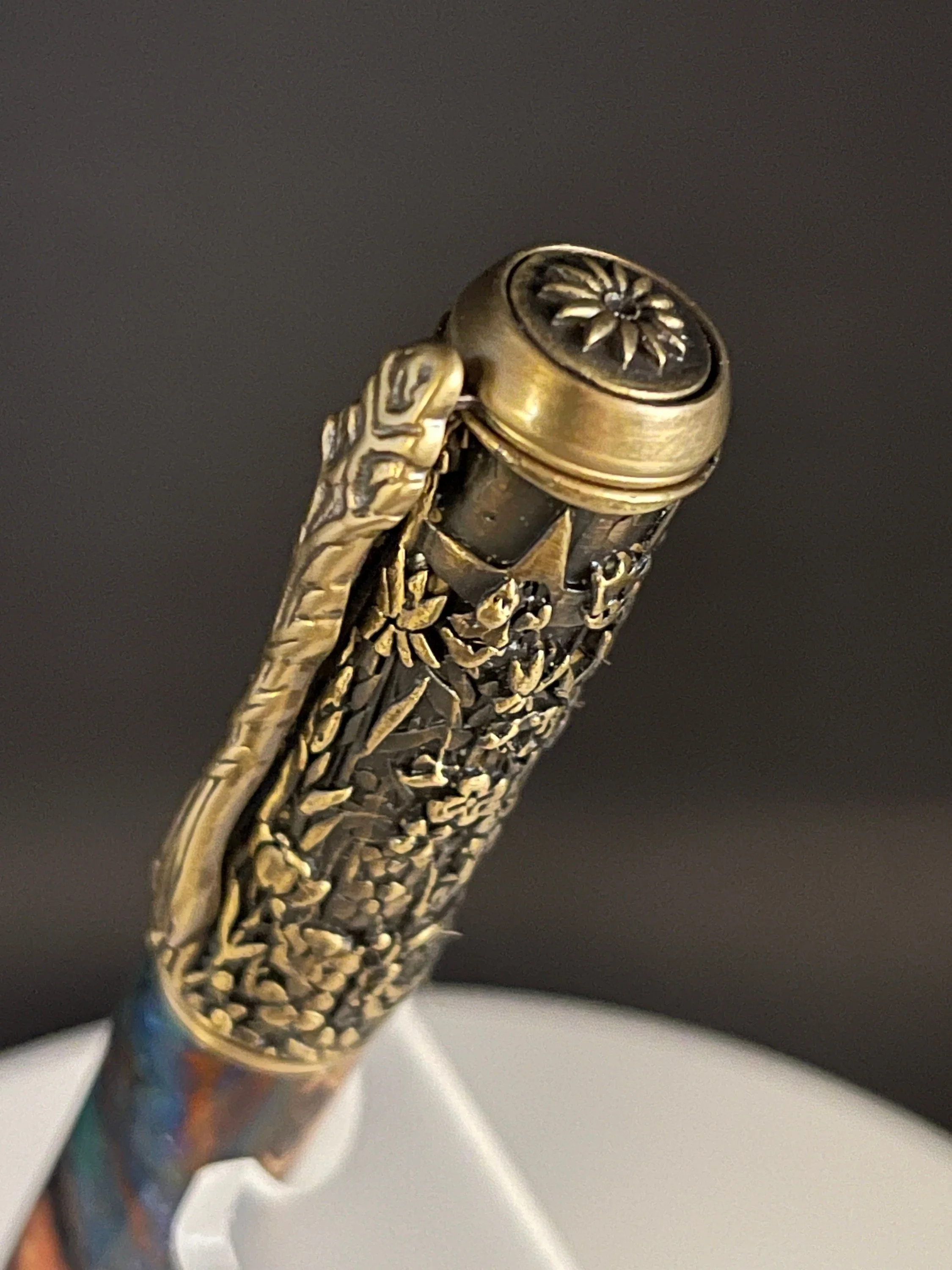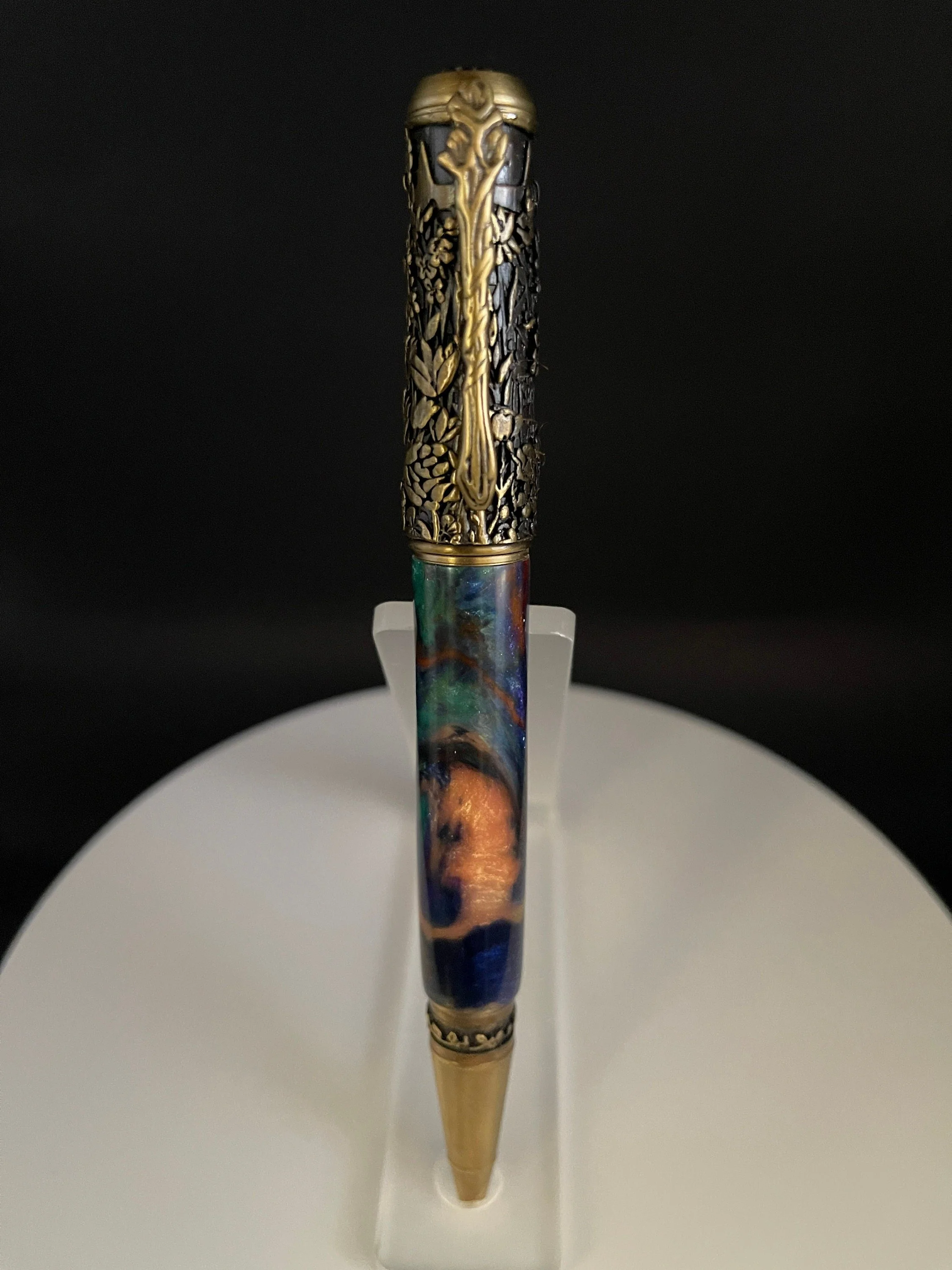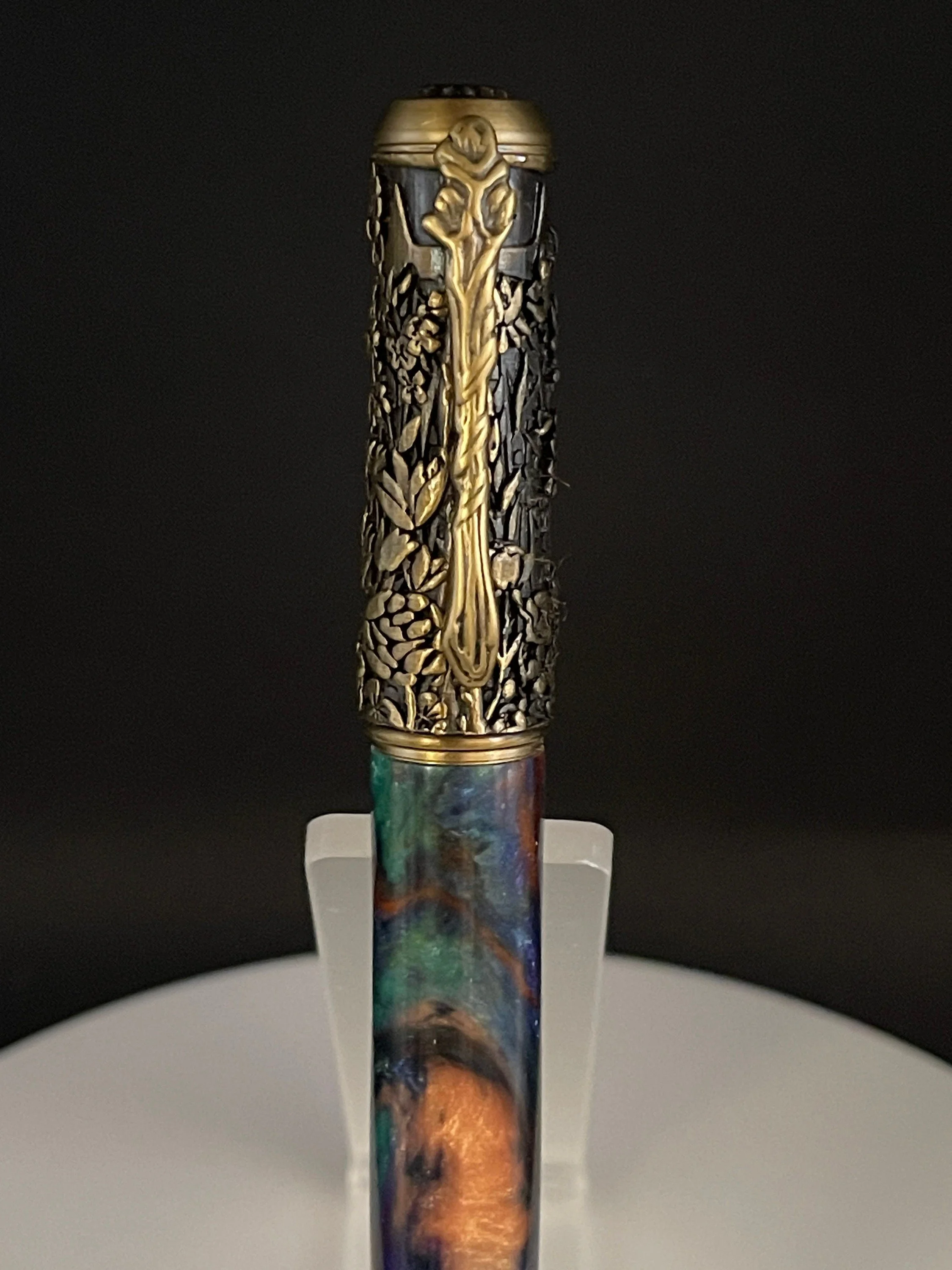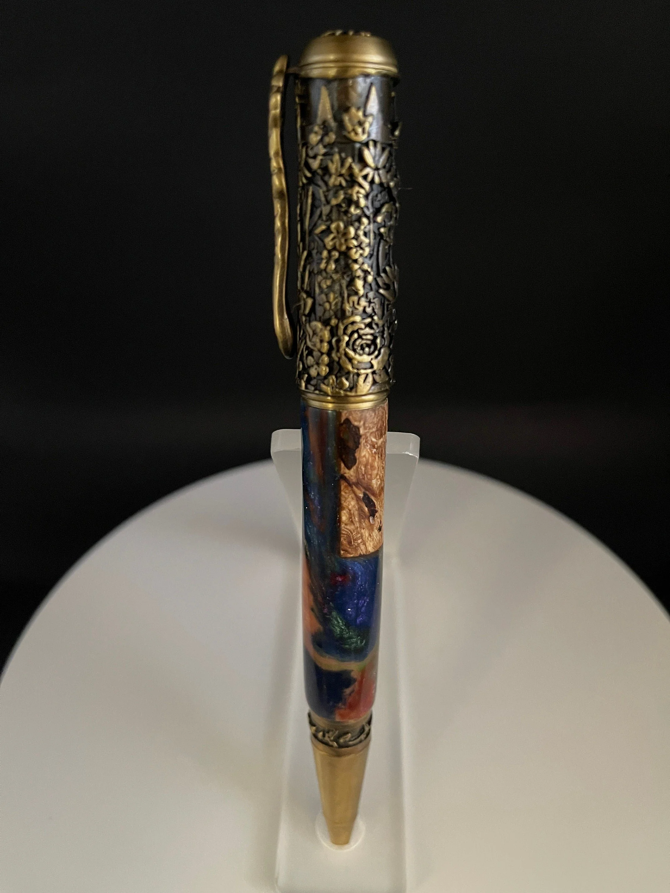 Unique hand-turned Resin with Walnut Pen. A Pen for lovers of flowers and all things botanical. The design combines a variety of natural elements from gardens and wildflowers as if growing from the pen itself to create the ultimate celebration of the botanical world around us. Exquisitely casted in intricate detail. On the pen end you will find wildflowers and grasses, with bugs and butterflies mixed within. The pen clip overlays the backend with similar flowers as if to pop-out from the pen end. The pen top includes a bursting bloom while the pen tip's wondering vine band adds another charming layer to the pen. Includes a smooth writing Parker style refill.