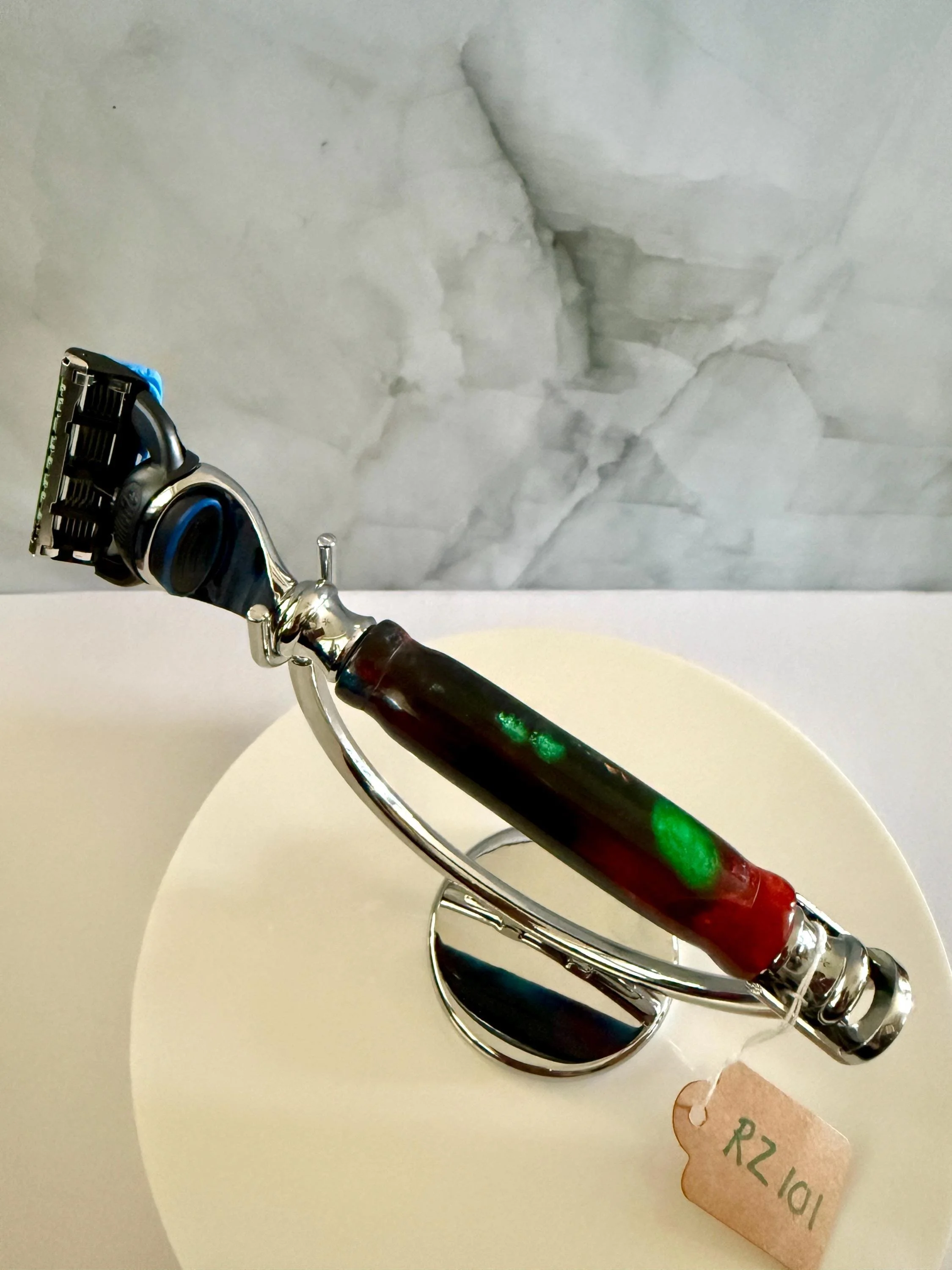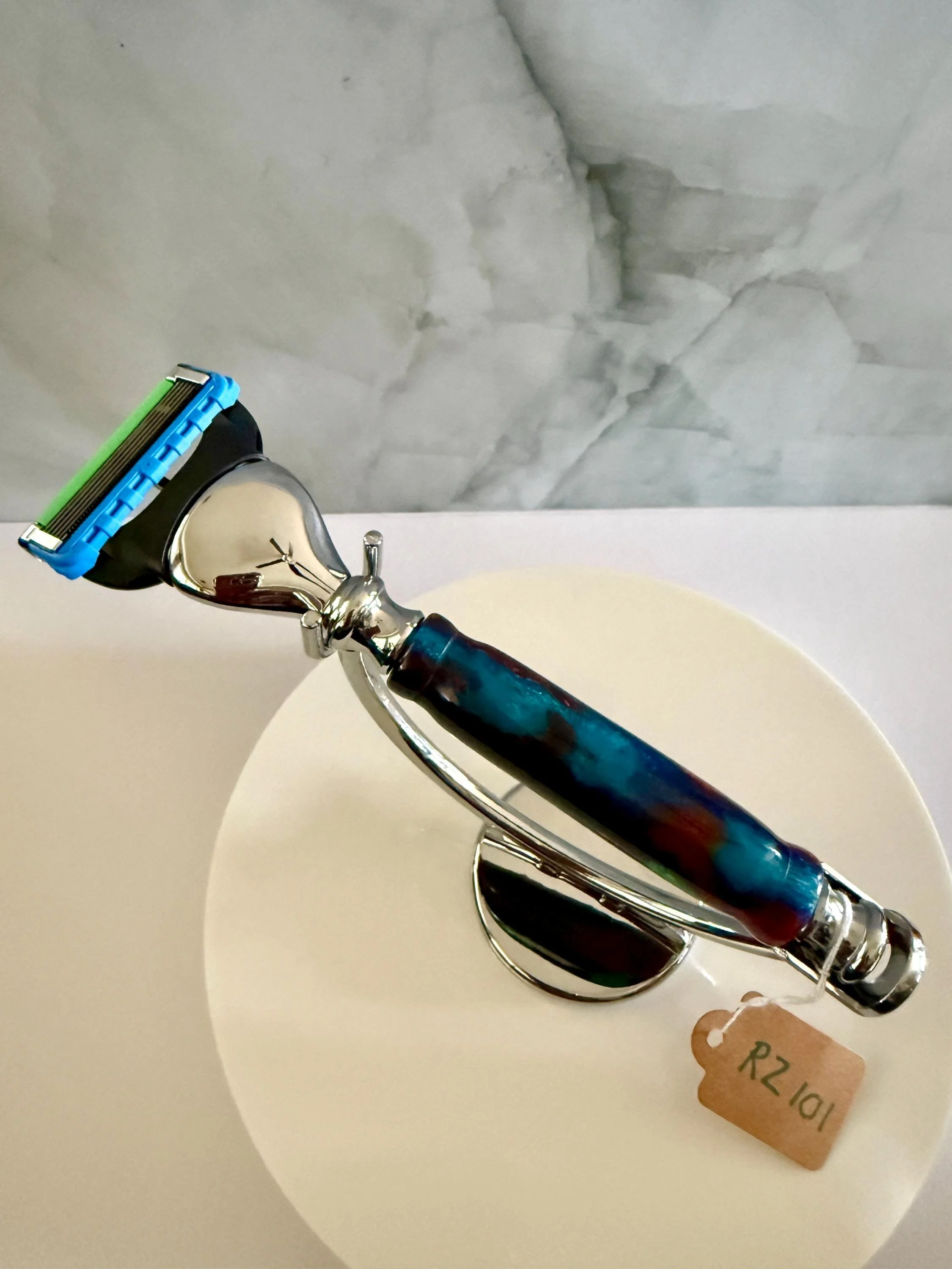 Hand Turned Resin Fusion Chrome razor. Makes a great gift for graduation, anniversary, Father's day, Mother's day, Special occasion, Manscaping. Includes 1 fusion cartridge.