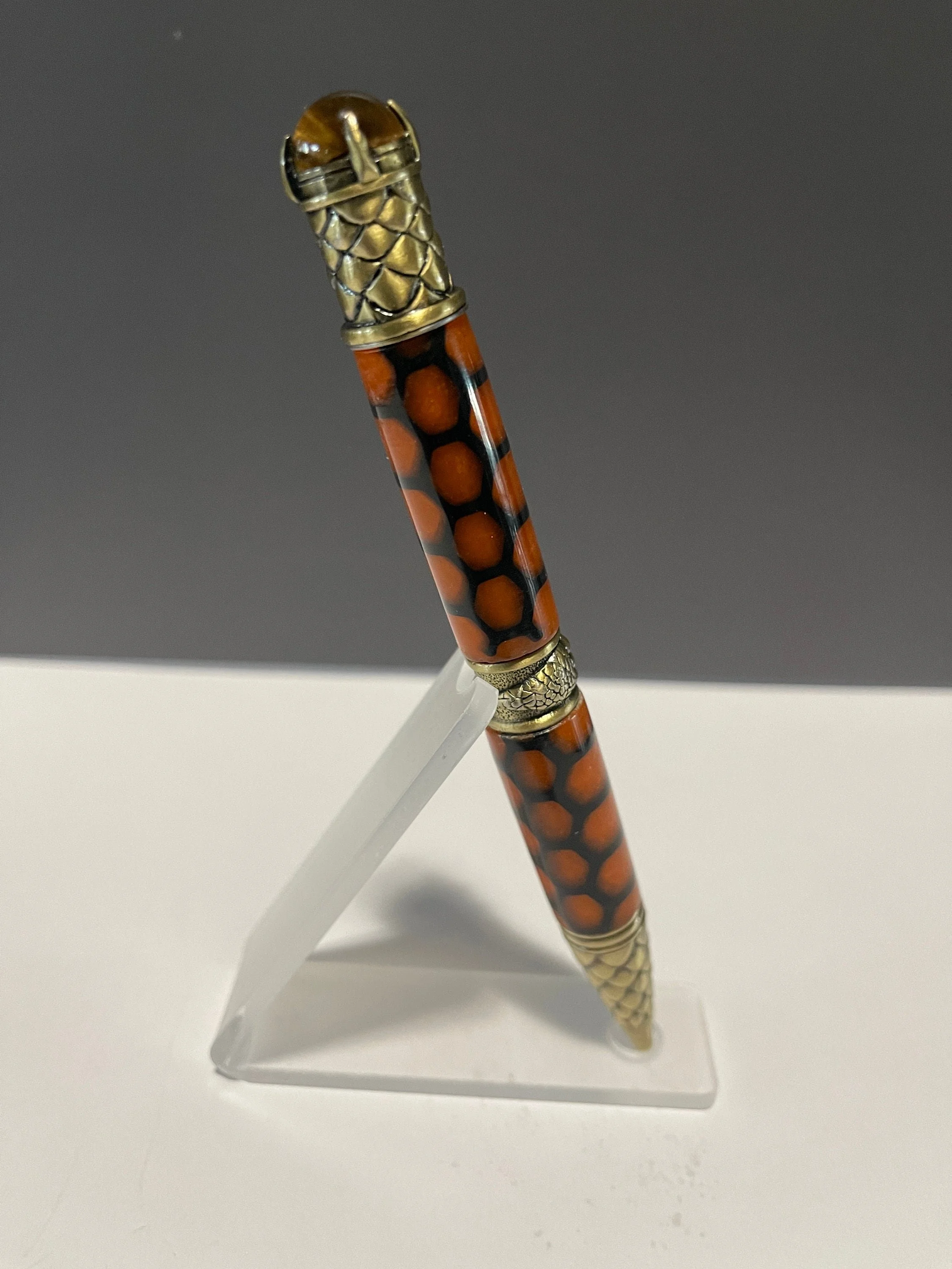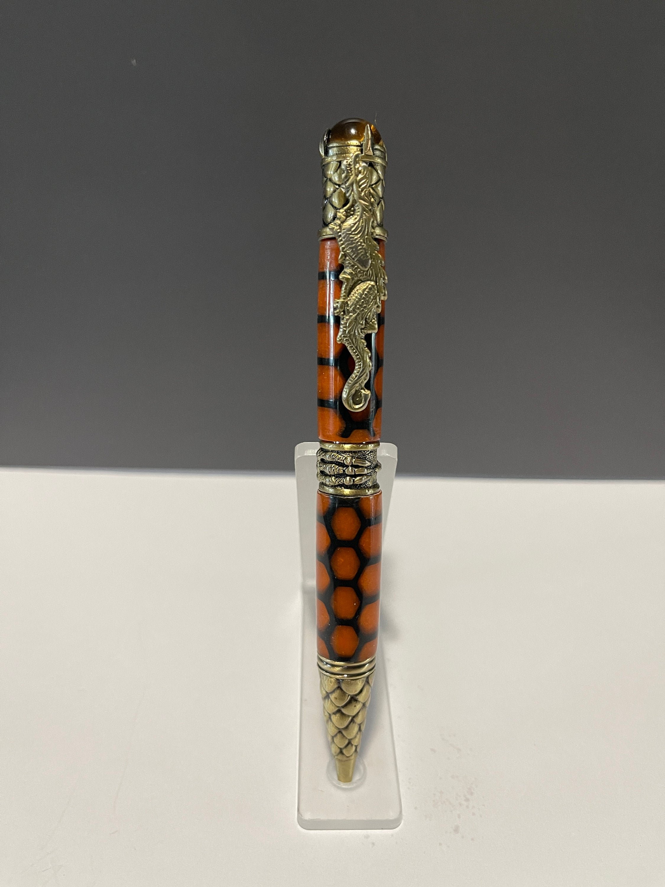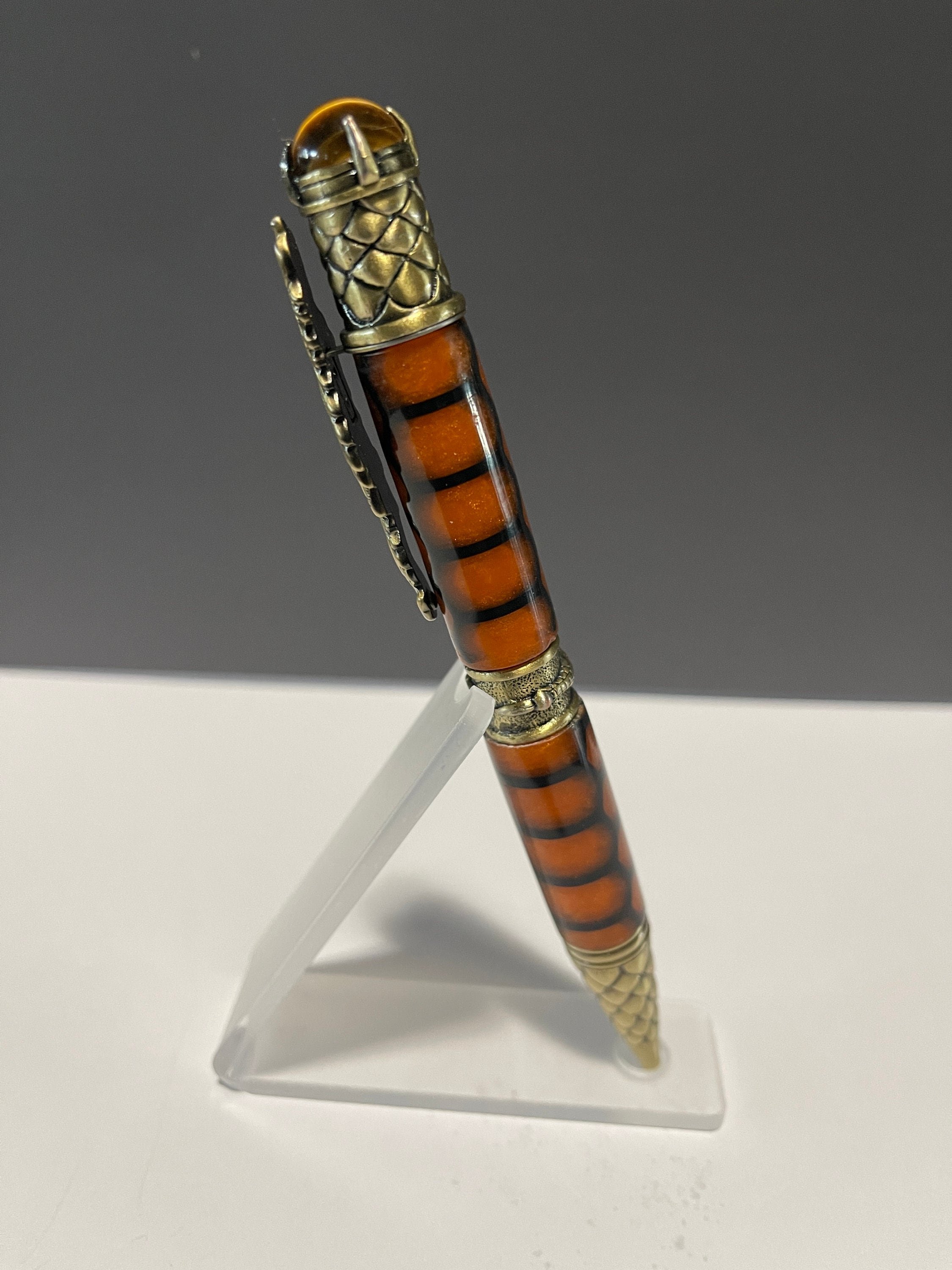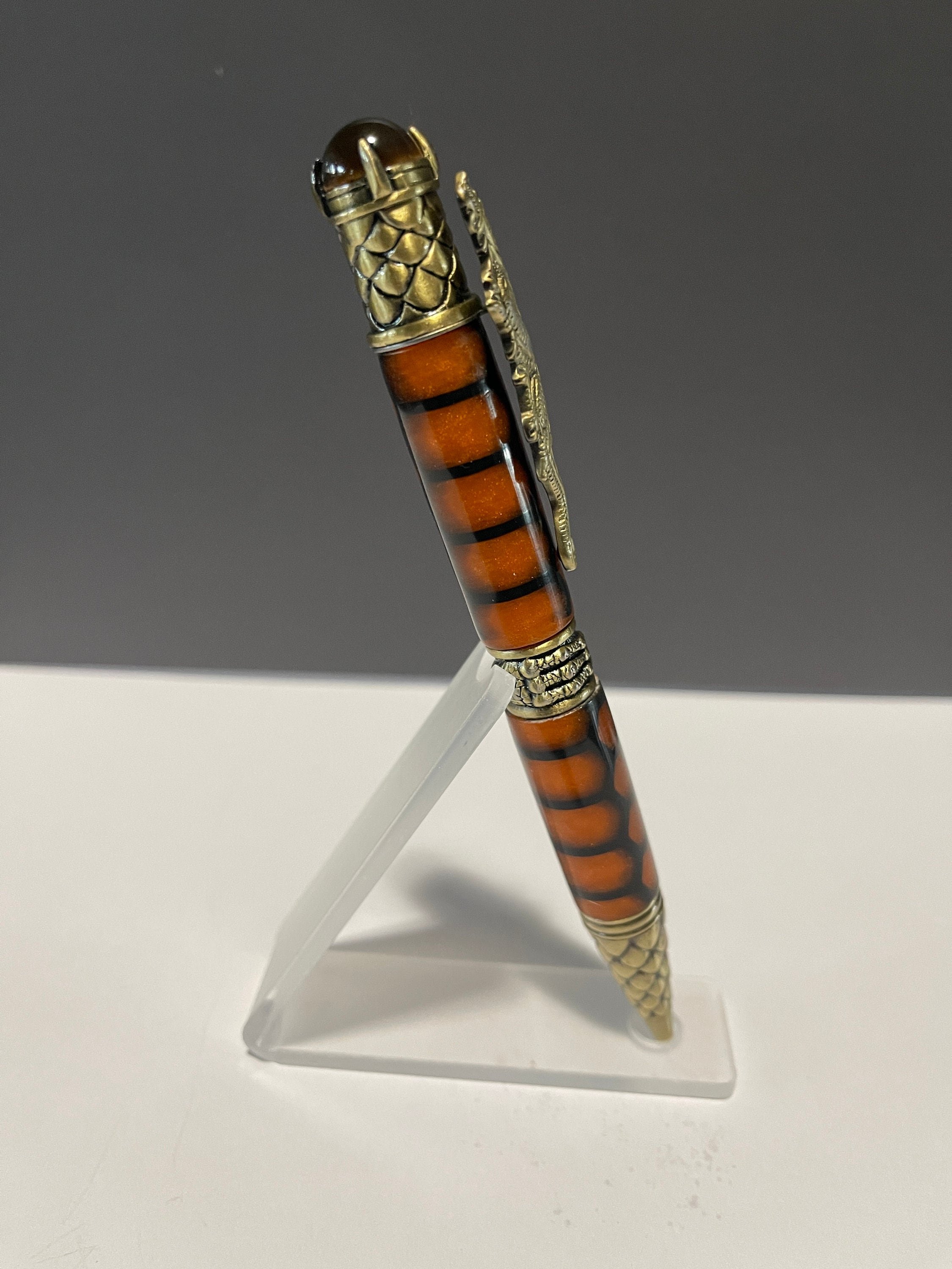 Unique hand-turned Resin Pen with Dragon theme. Pen is a little heavy and thick, but is stunningly beautiful. Includes acrylic pen stand. This dramatic and beautifully sculpted pen makes the perfect gift for any Dragon lover. Great attention is given to the exquisite details of the dragon. The clip is a full body, mighty crouching Chinese dragon. The band features a dragon claw grasping the center - a sign of strength and willpower. The pen tip and end cap are covered in the armored scales of the dragon; scales can be seen as a sign of protection. And the Tigers Eye crystal on the end, known to be very effective for instilling courage, strength of will and self-confidence - gripped in place by additional talons. Includes a Parker style refill.