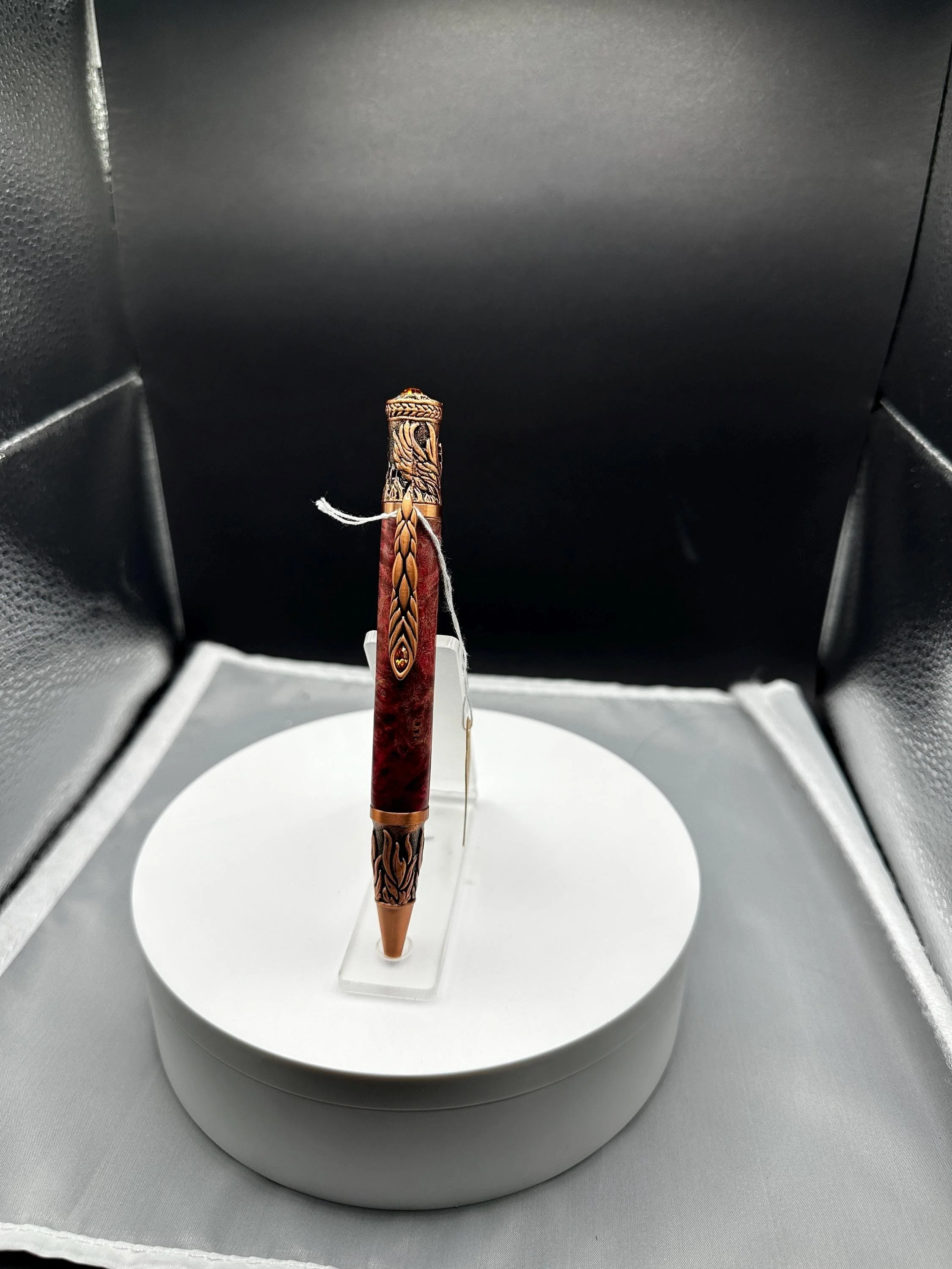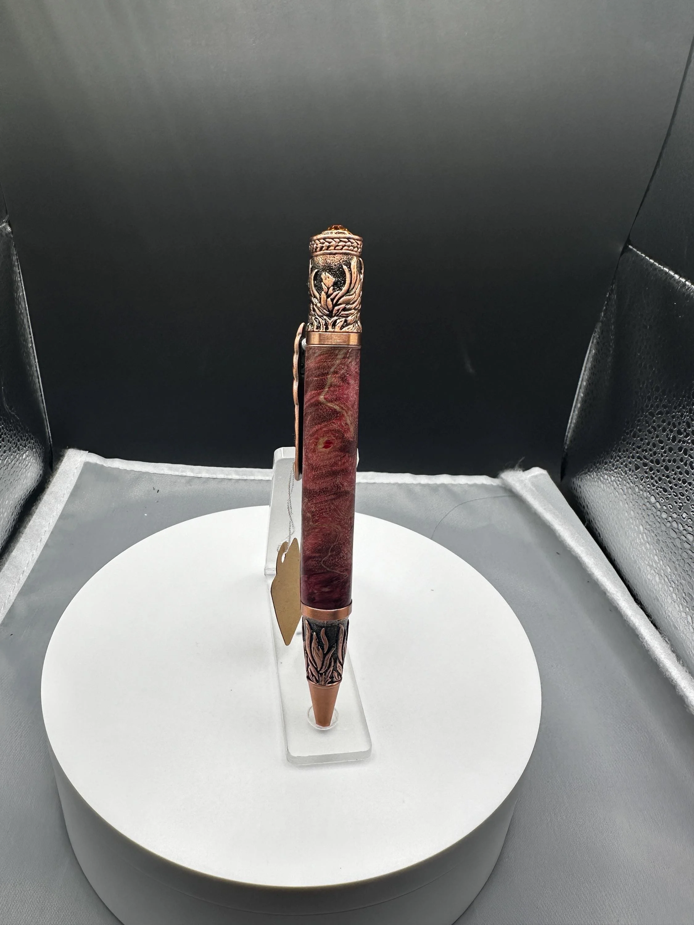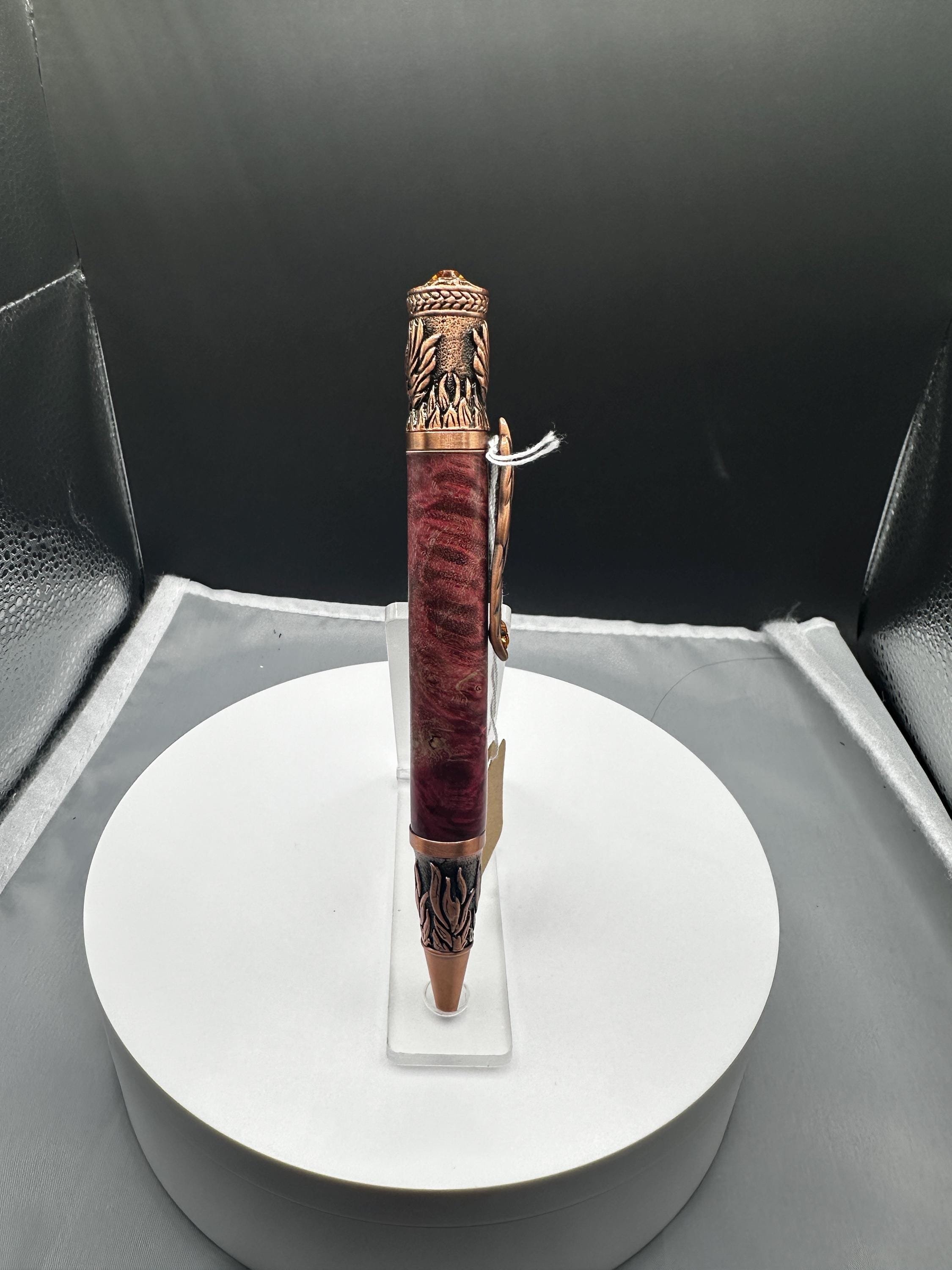 This Red Dyed Maple burl pen is made with a Phoenix Twist Style pen in Antique copper. The pen details include a Phoenix Engraved clip and tip for added authenticity. It comes with a black, medium-point Parker-style refill and measures 5 1/4" long.