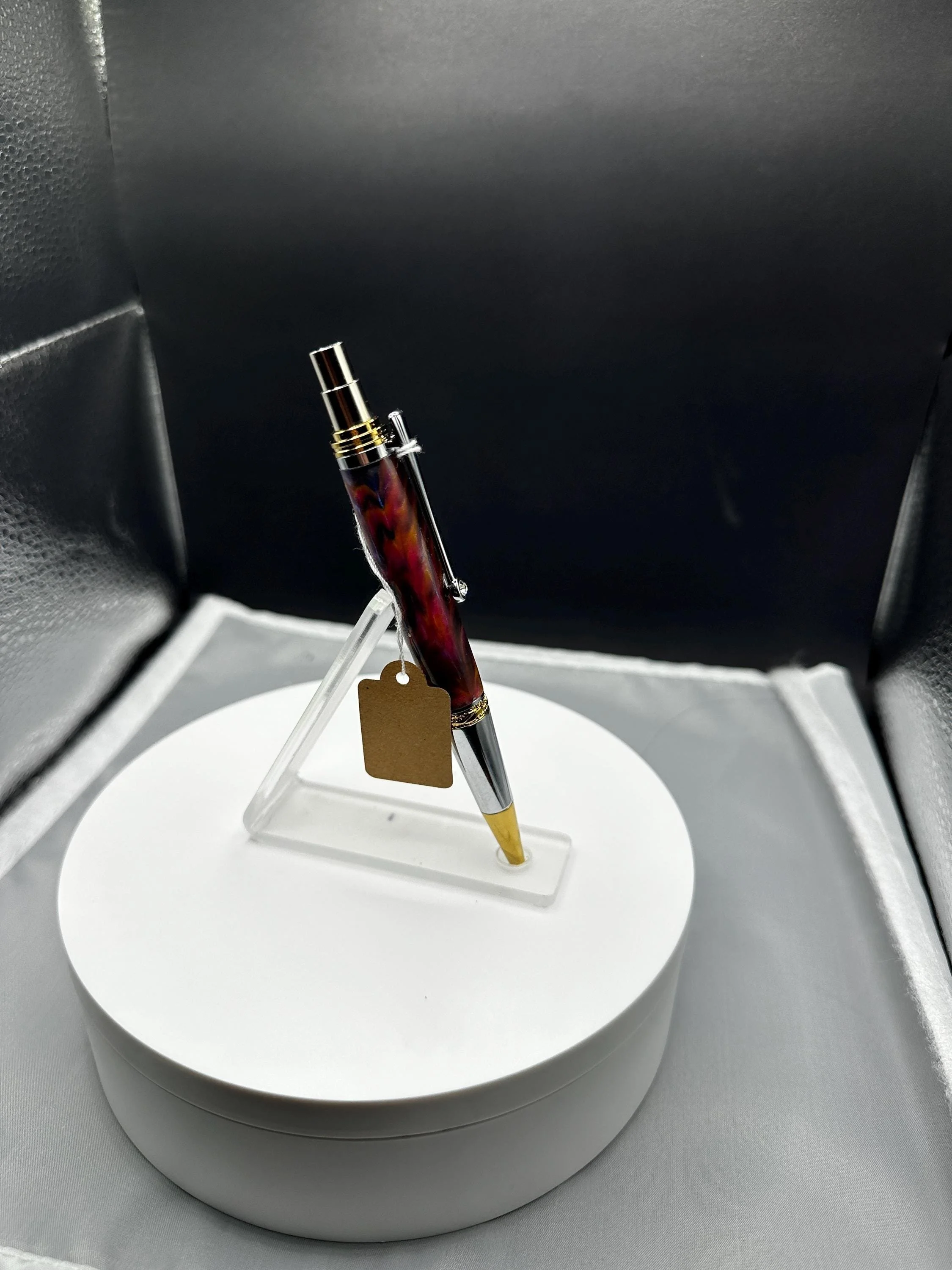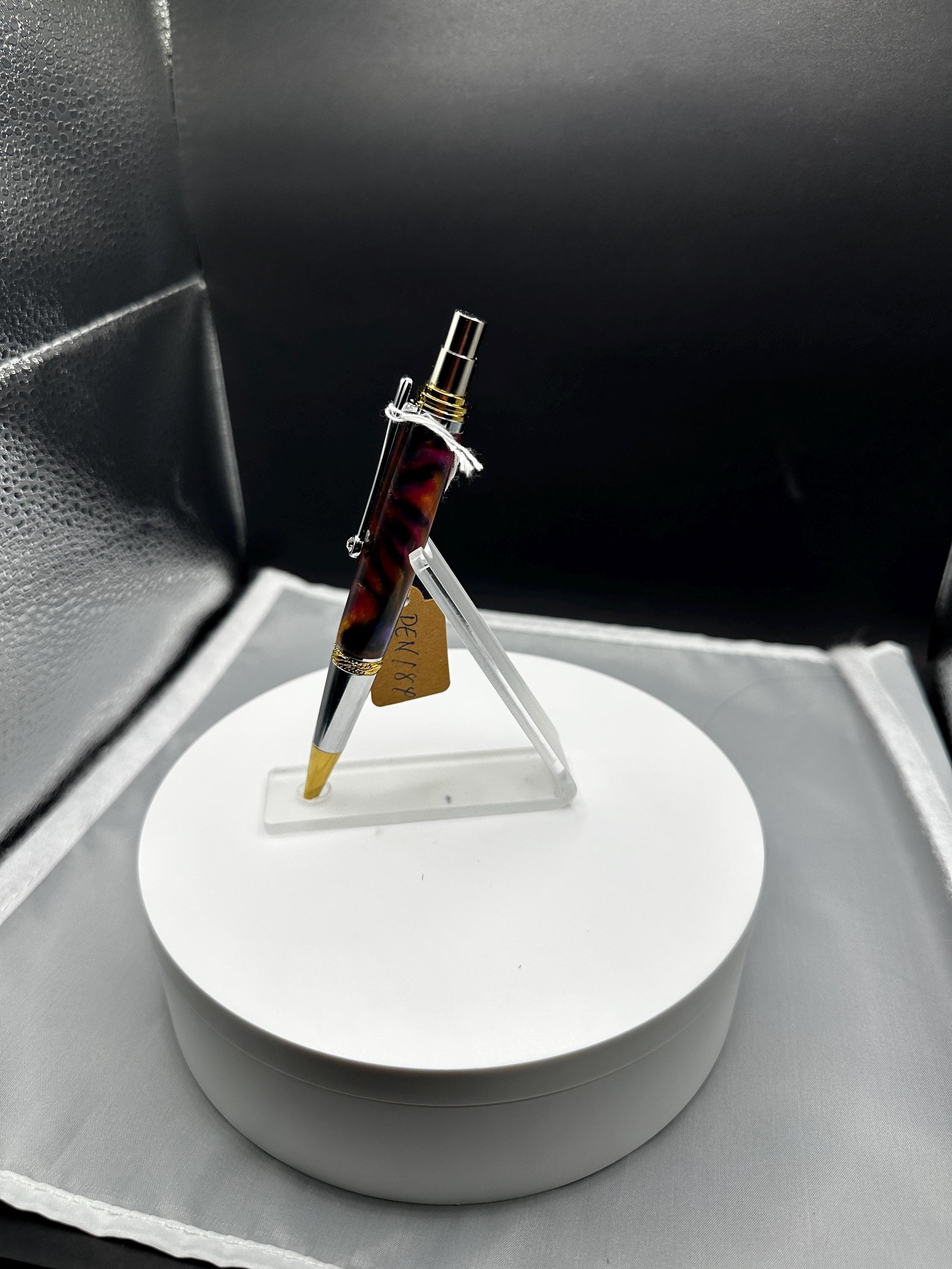 This multi-colored Resin Pen has a Gun Metal & Chrome mechanism . This EDC Click version features the ultra-reliable, all-metal Schmidt SKM-88 mechanism, precision-engineered in Germany for lasting performance. It uses the same accessories as the original Majestic Squire and takes a popular Parker-style ballpoint refill. Has a signature Swarovski crystal, and elegant plating, it is a standout for everyday carry or gift giving. A great Valentine's present.