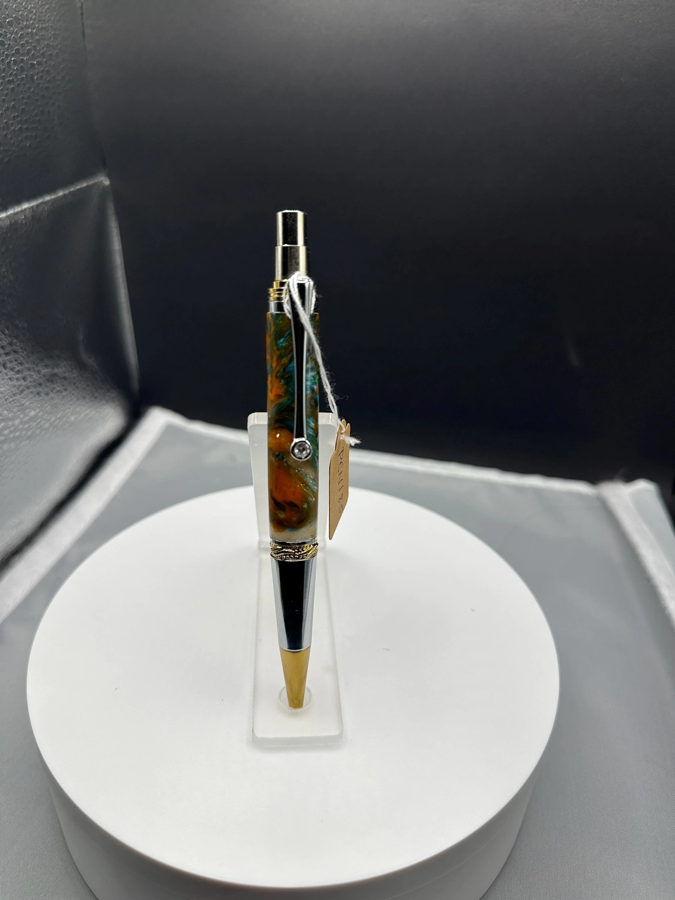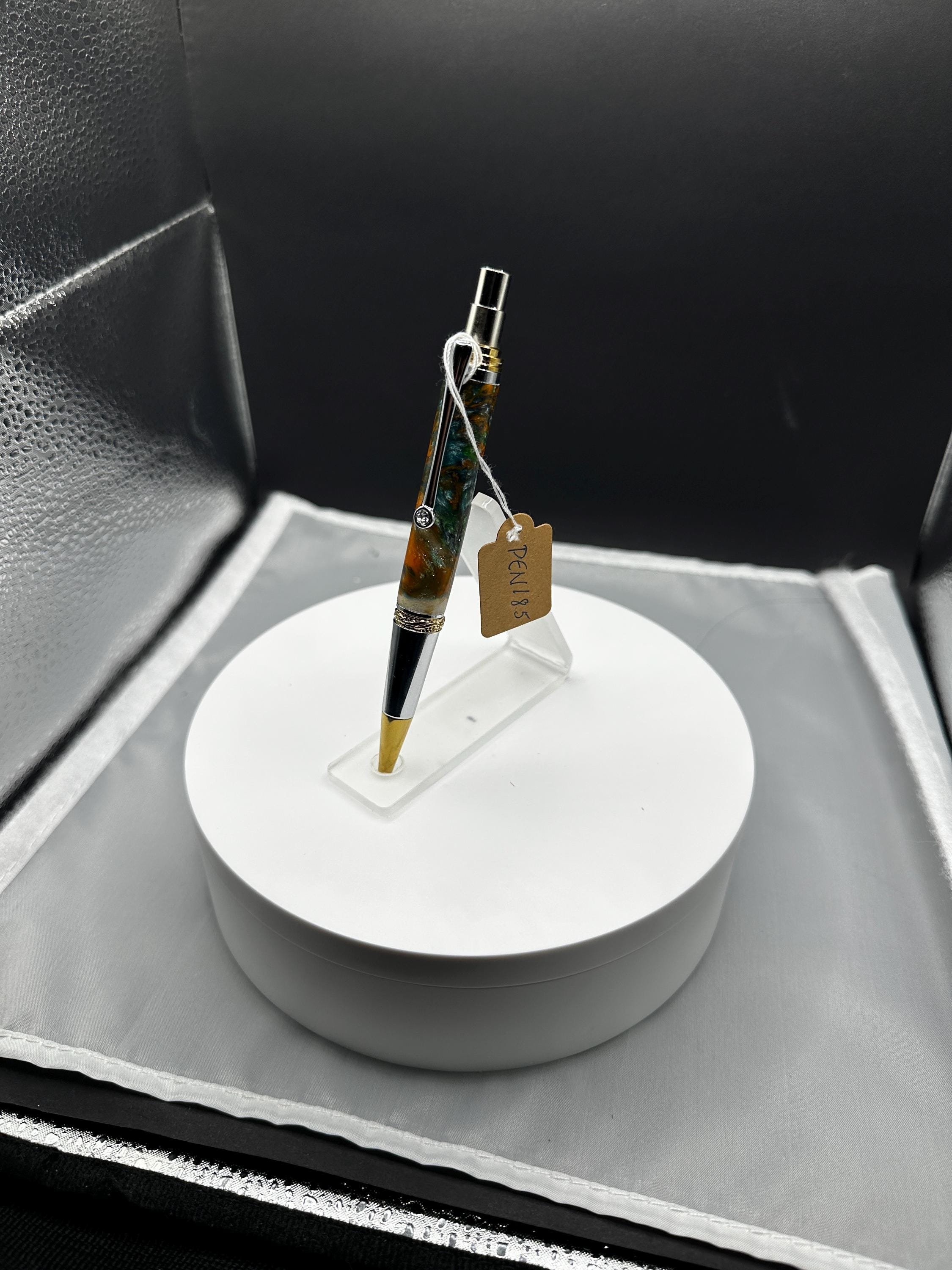 This Multi-colored Resin Pen has a Gold Titanium & Chrome mechanism . This EDC Click version features the ultra-reliable, all-metal Schmidt SKM-88 mechanism, precision-engineered in Germany for lasting performance. It uses the same accessories as the original Majestic Squire and takes a popular Parker-style ballpoint refill. Has a signature Swarovski crystal, and elegant plating, it is a standout for everyday carry or gift giving. A great Valentine's present.