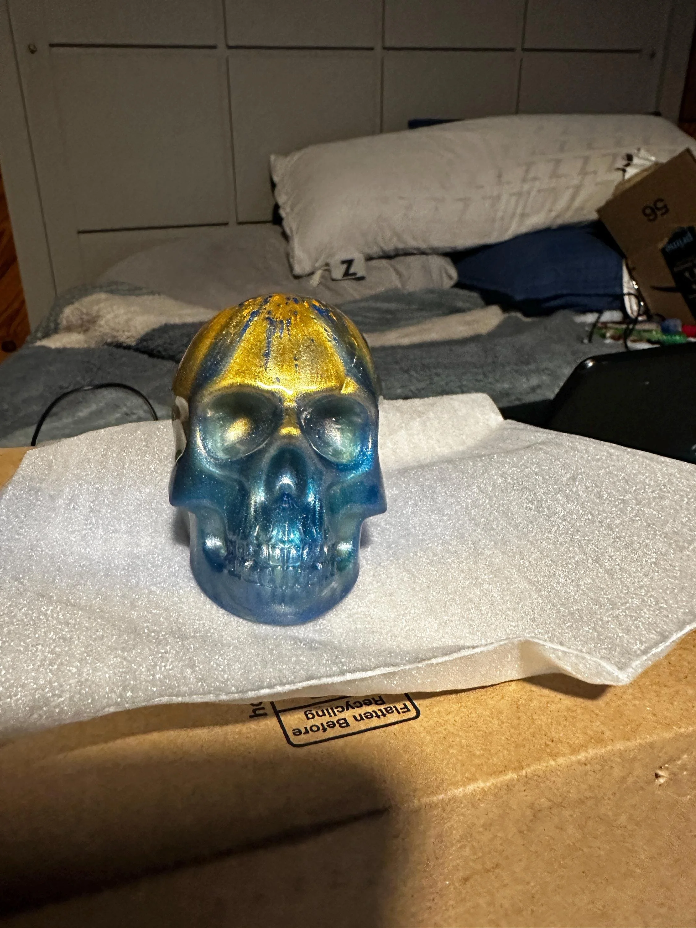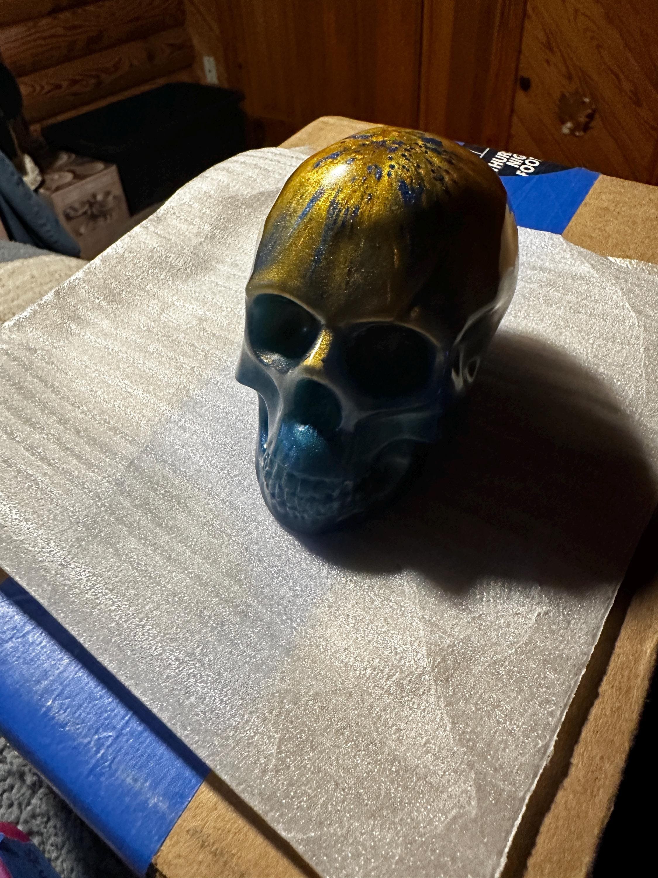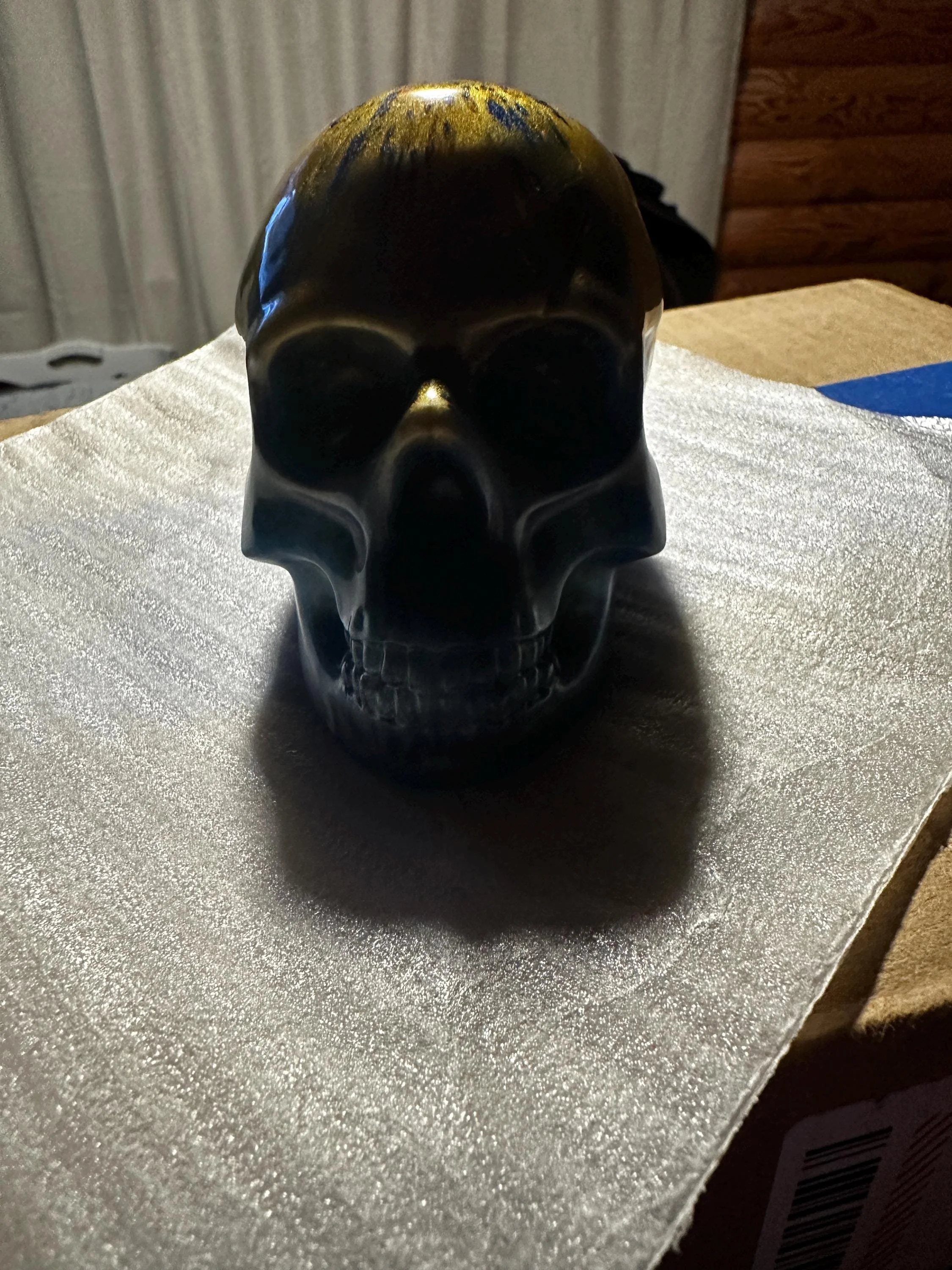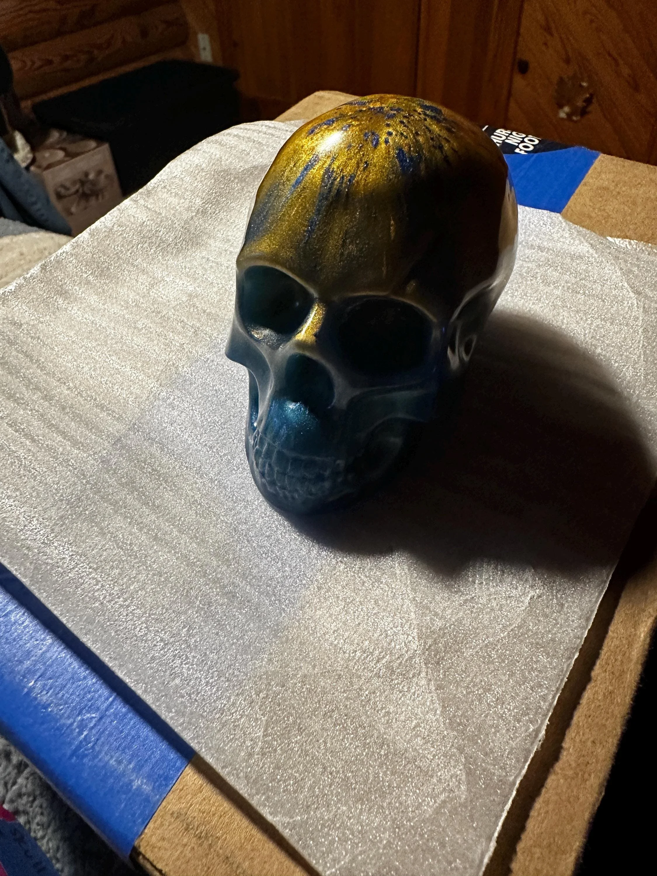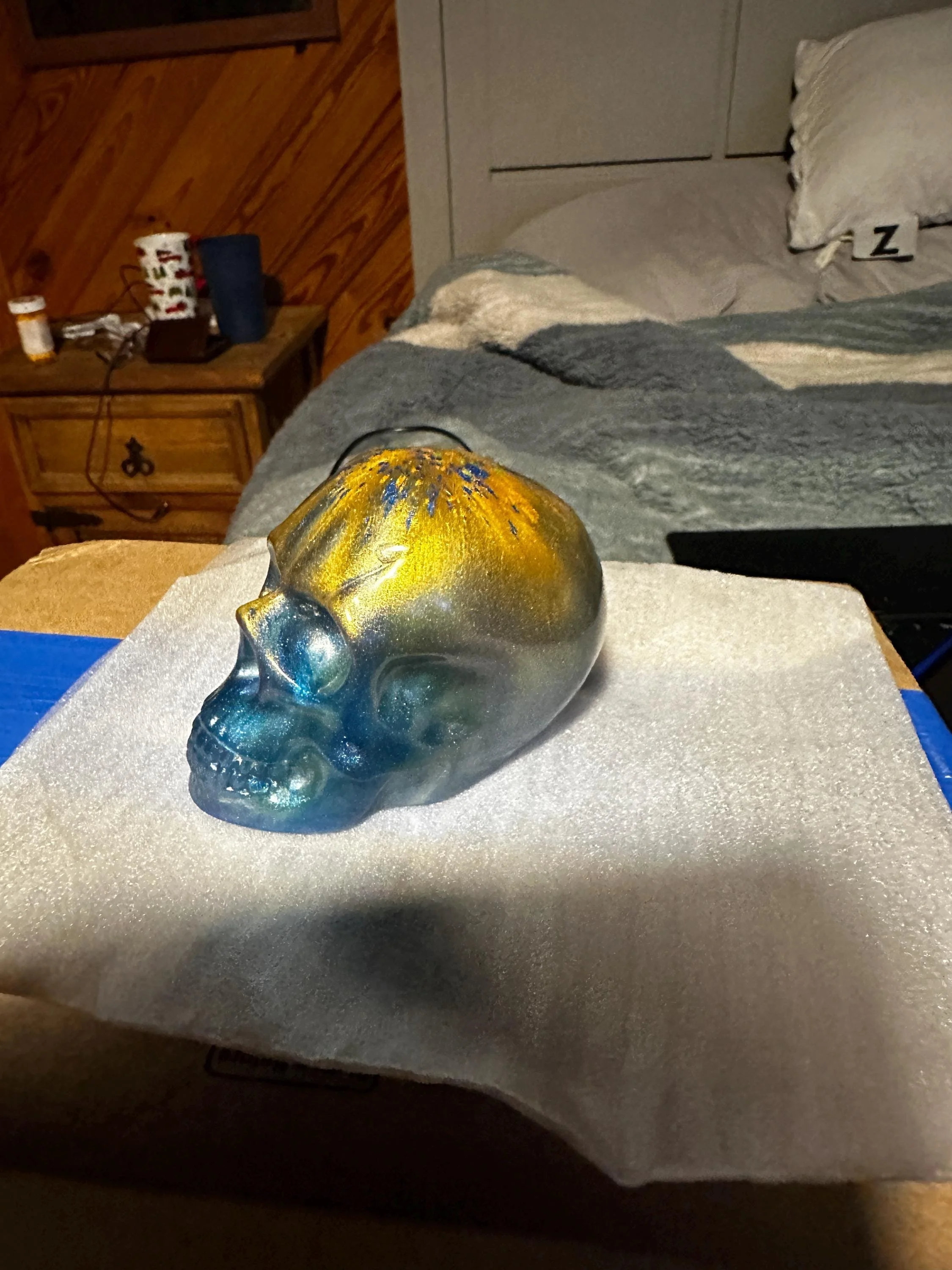 Shop › SK105 - Resin Skull - Blue/Gold Image 1 of 5 Image 2 of 5 Image 3 of 5 Image 4 of 5 Image 5 of 5 SK105 - Resin Skull - Blue/Gold $15.00 sold out ~3x3" Resin Skull Purple/Green/Silver in Color. Can be used as paperweight, Halloween ornament, Pencil holder. Sold Out Added! ~3x3" Resin Skull Purple/Green/Silver in Color. Can be used as paperweight, Halloween ornament, Pencil holder.