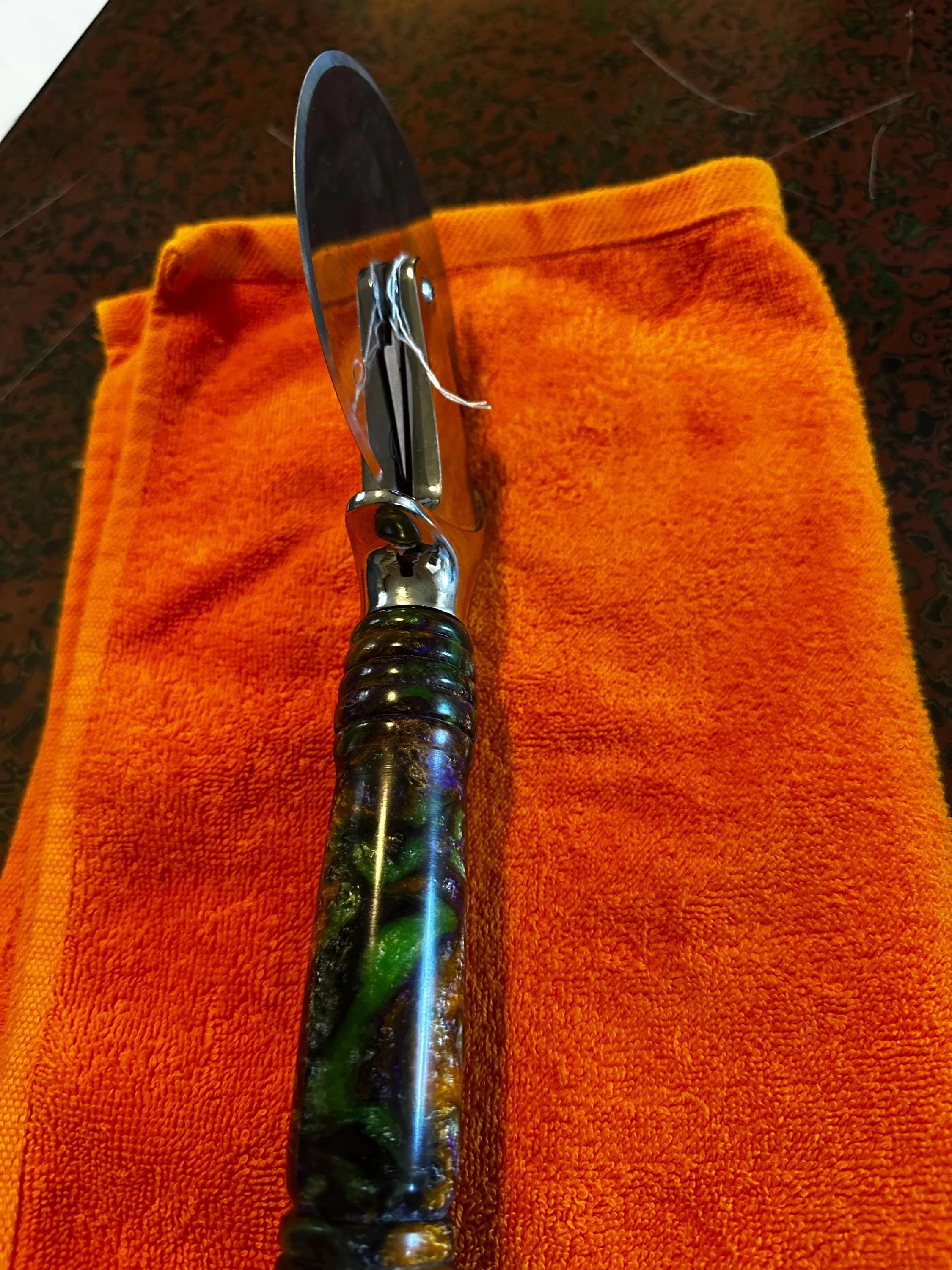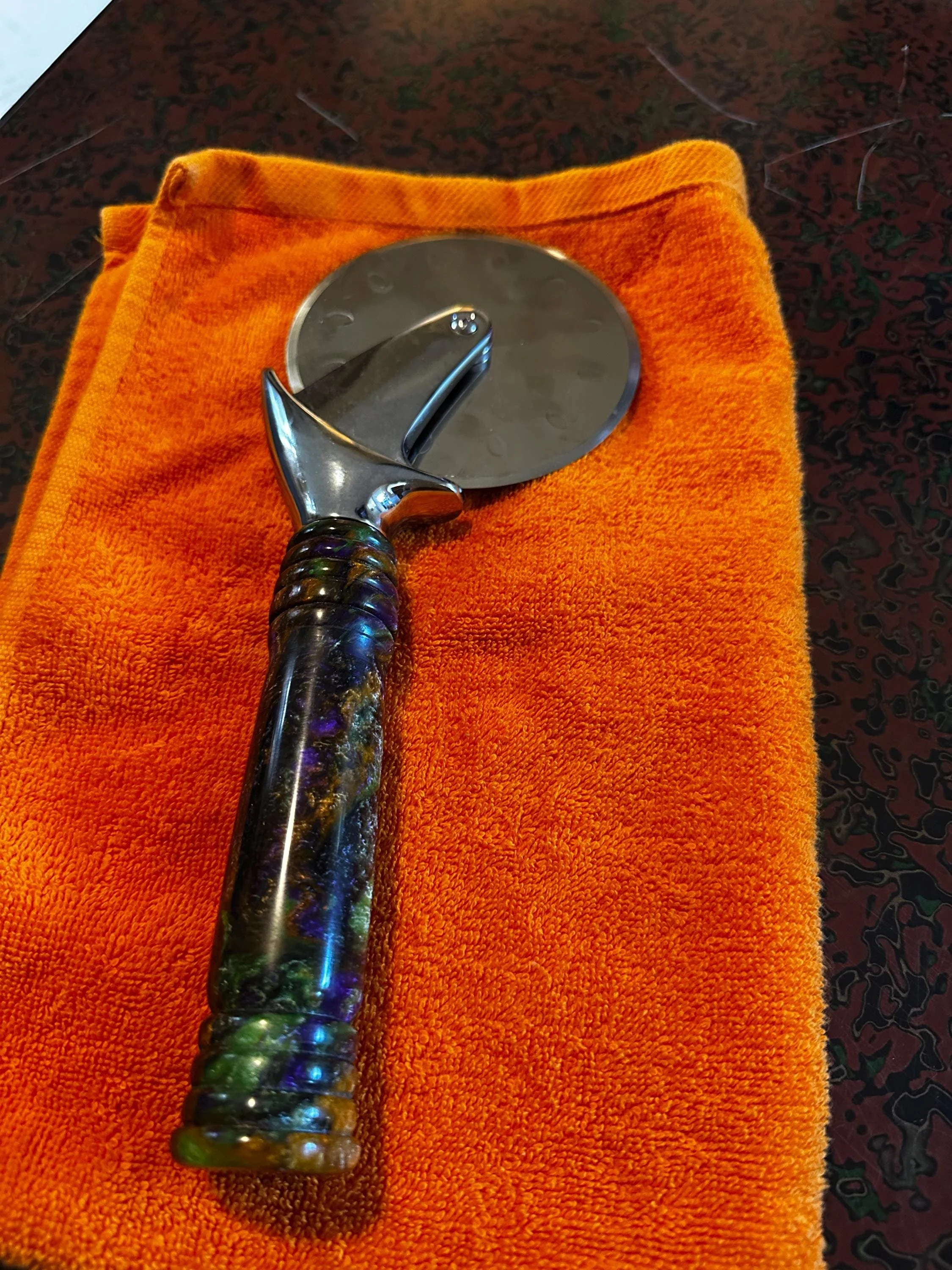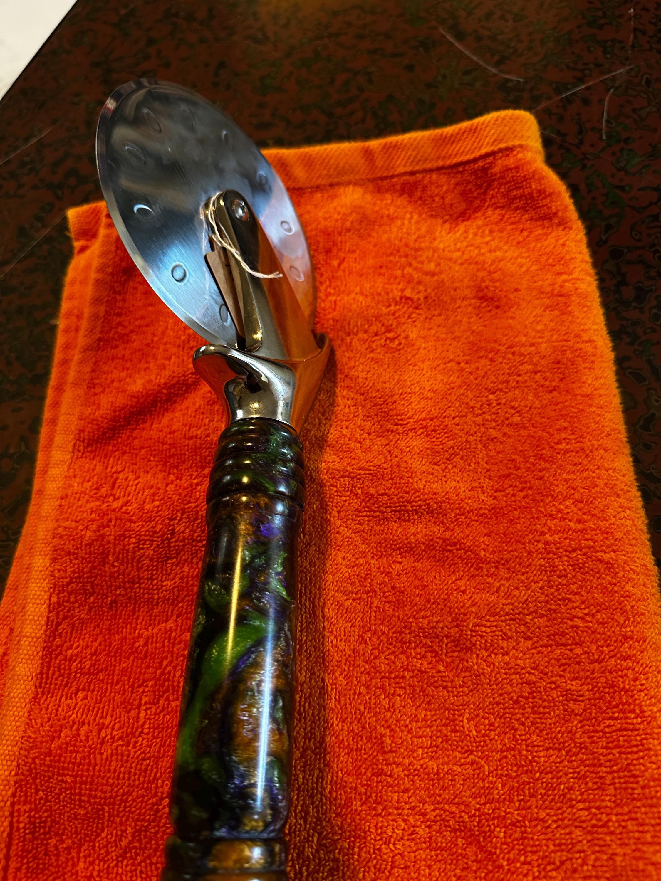 Stainless Steel Pizza cutter with unique resin Handle. Makes for a wonderful Valentine's gift, Christmas Gift, Birthday gift, Wedding Gift, Custom Gift, One of a Kind gift, Retirement gift, Mother's Day gift, Father's Day gift.