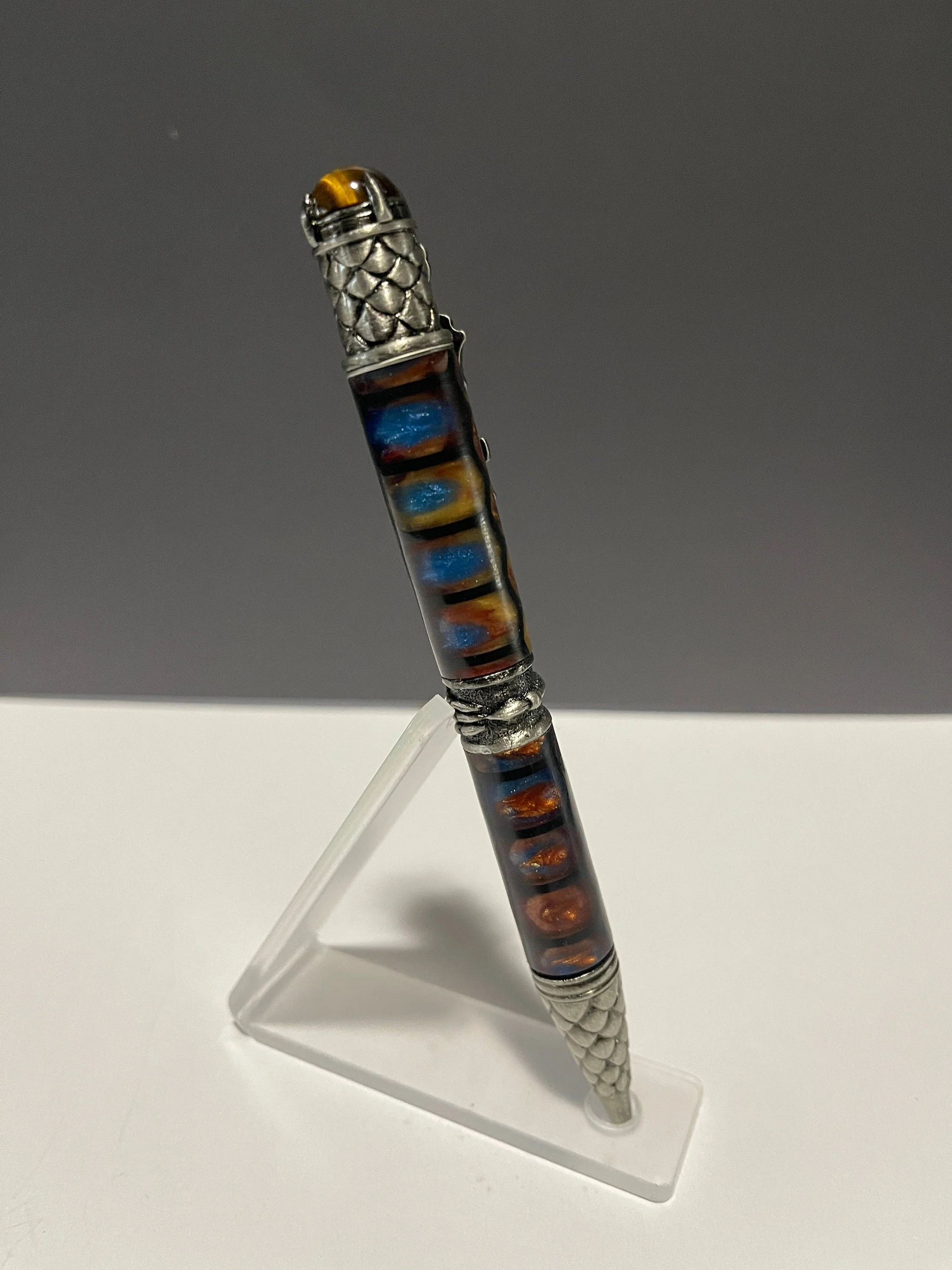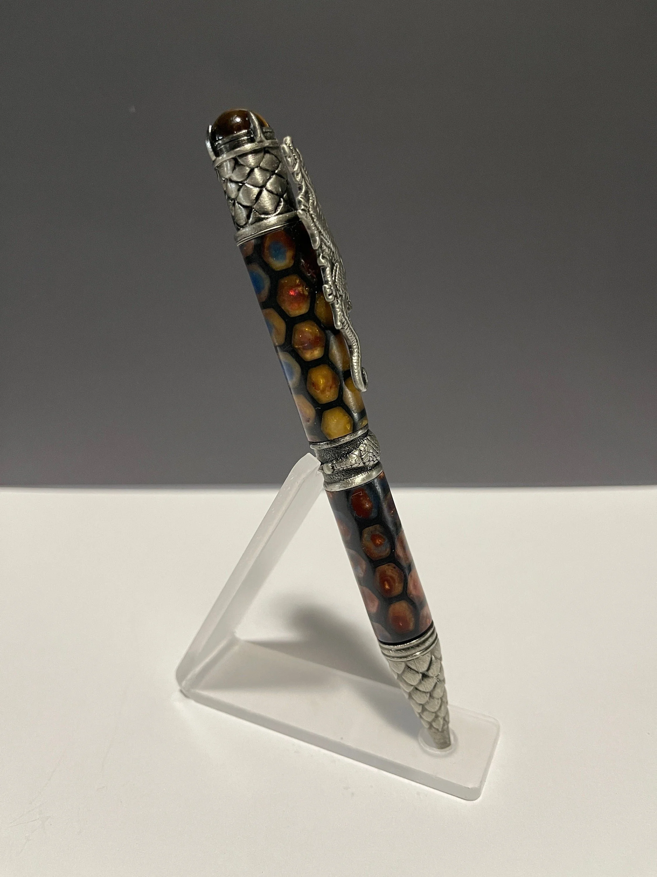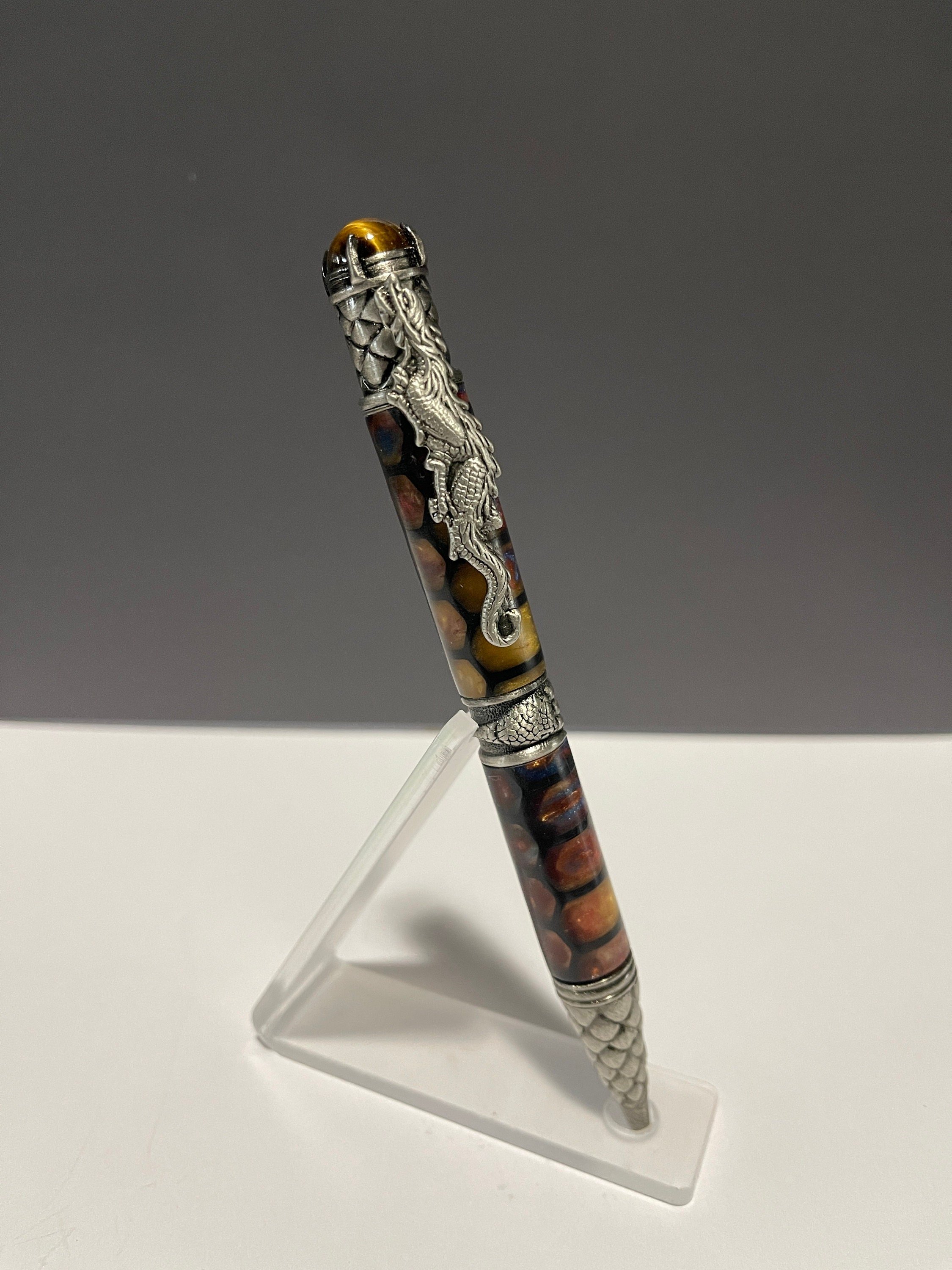 Unique hand-turned Resin Pen with Dragon theme. Pen is a little heavy and thick, but is stunningly beautiful. Unique hand-turned Resin Pen with Dragon theme. Pen is a little heavy and thick, but is stunningly beautiful. Includes acrylic pen stand. This dramatic and beautifully sculpted pen makes the perfect gift for any Dragon lover. Great attention is given to the exquisite details of the dragon. The clip is a full body, mighty crouching Chinese dragon. The band features a dragon claw grasping the center - a sign of strength and willpower. The pen tip and end cap are covered in the armored scales of the dragon; scales can be seen as a sign of protection. And the Tigers Eye crystal on the end, known to be very effective for instilling courage, strength of will and self-confidence - gripped in place by additional talons. Includes a Parker style refill.