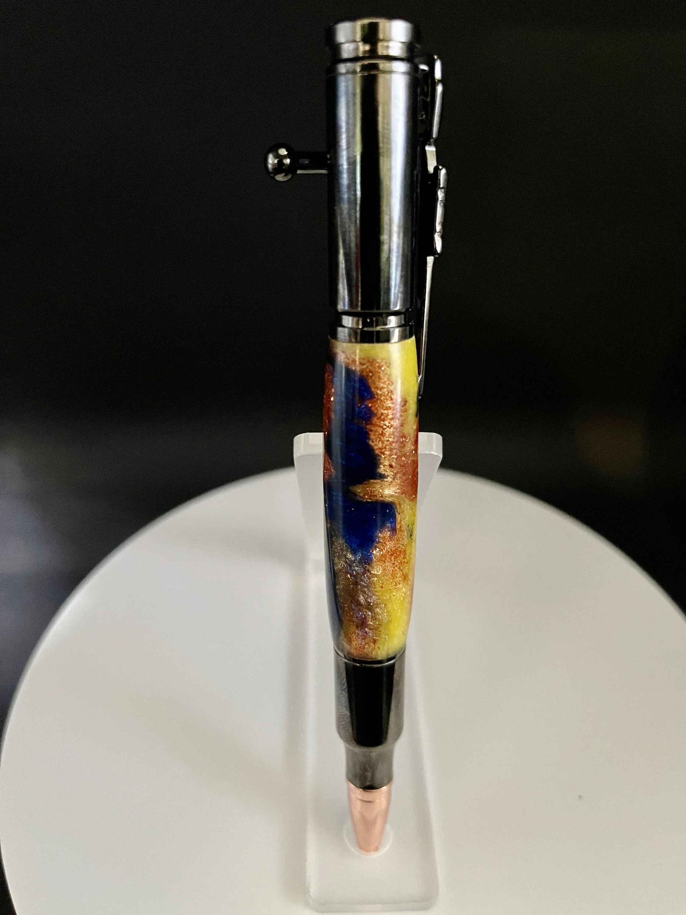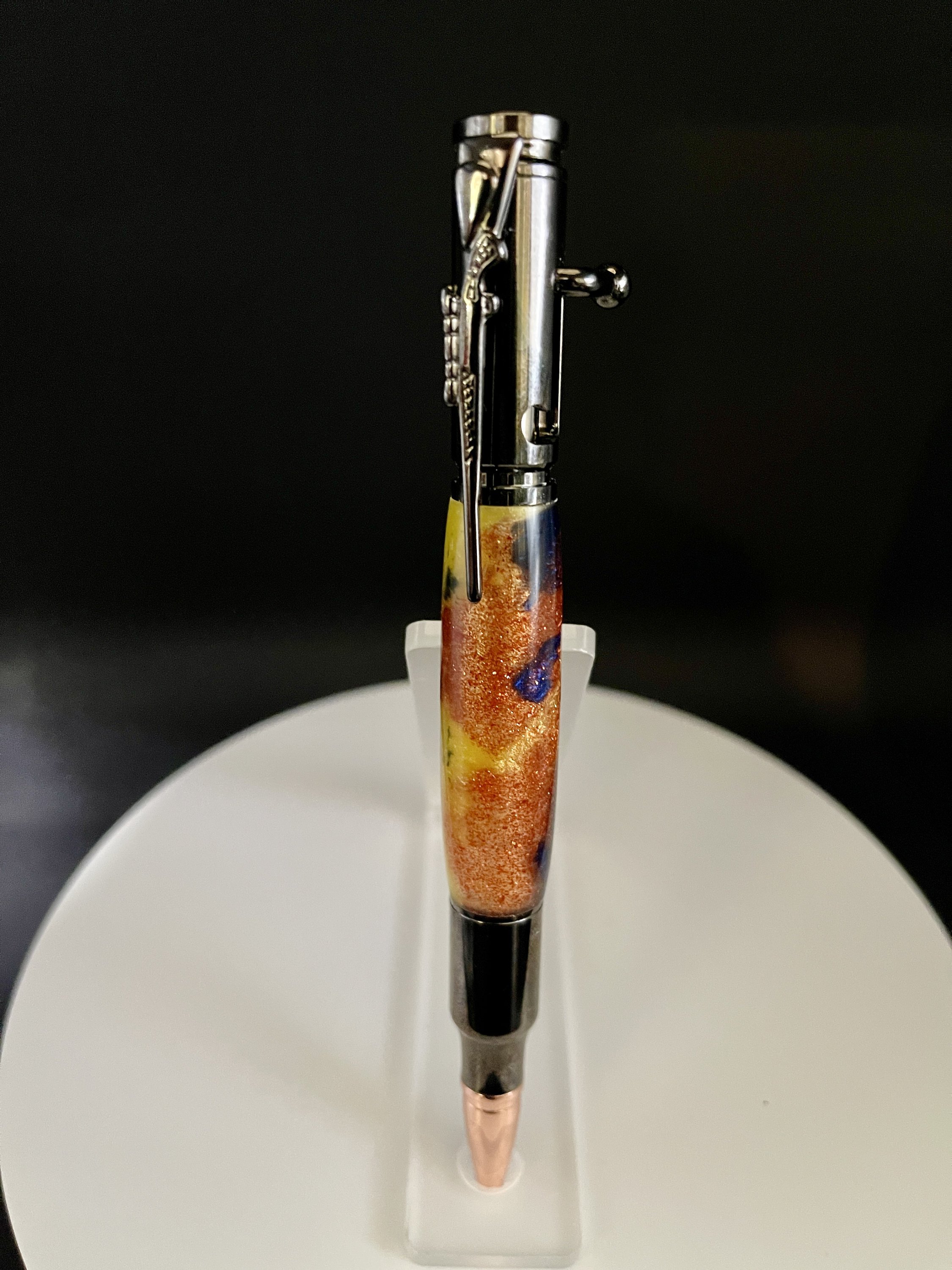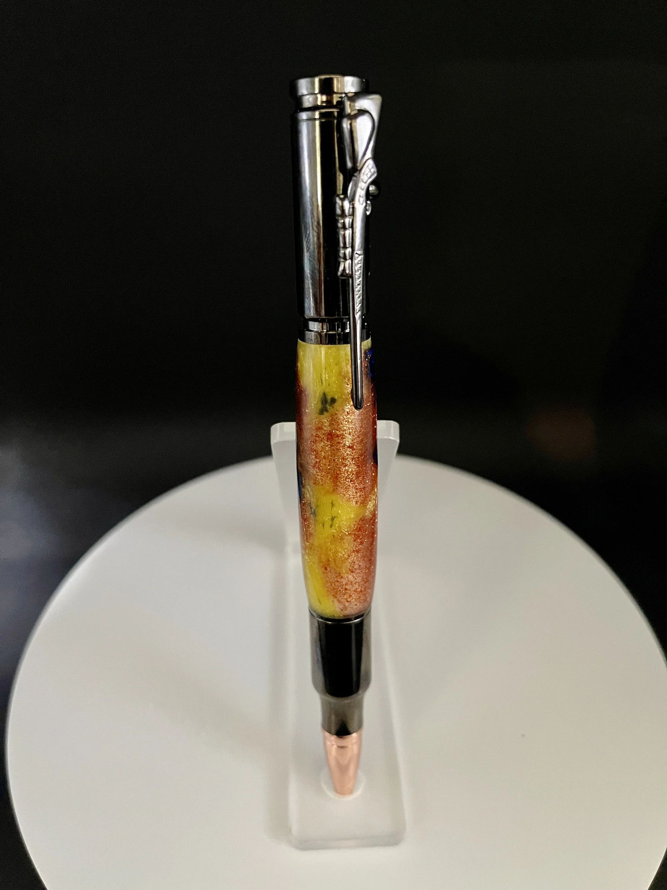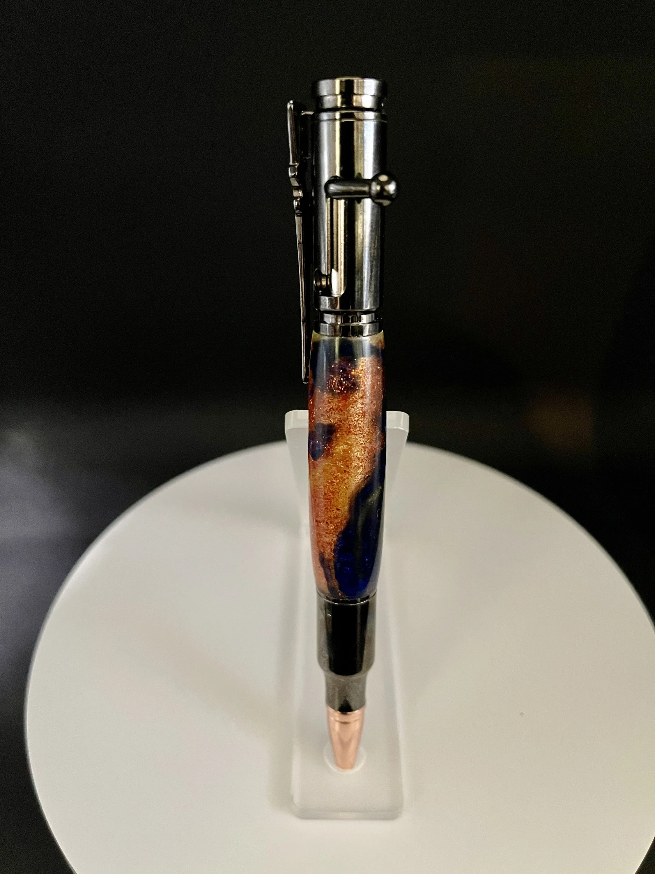 A fun Bolt Action pen that will be hard for any hunting or target-shooting enthusiast to put down. The realistic bolt-action handle smoothly advances and retracts to securely lock the refill in place. Includes a bolt action rifle clip and a replica 30 caliber cartridge and rose gold bullet tip for added authenticity. Uses a Parker Refill. Makes for a wonderful Valentine's gift, Christmas Gift, Birthday gift, Wedding Gift(GroomsMen), Custom Gift, One of a Kind gift, Retirement gift, Mother's Day gift, Father's Day gift.