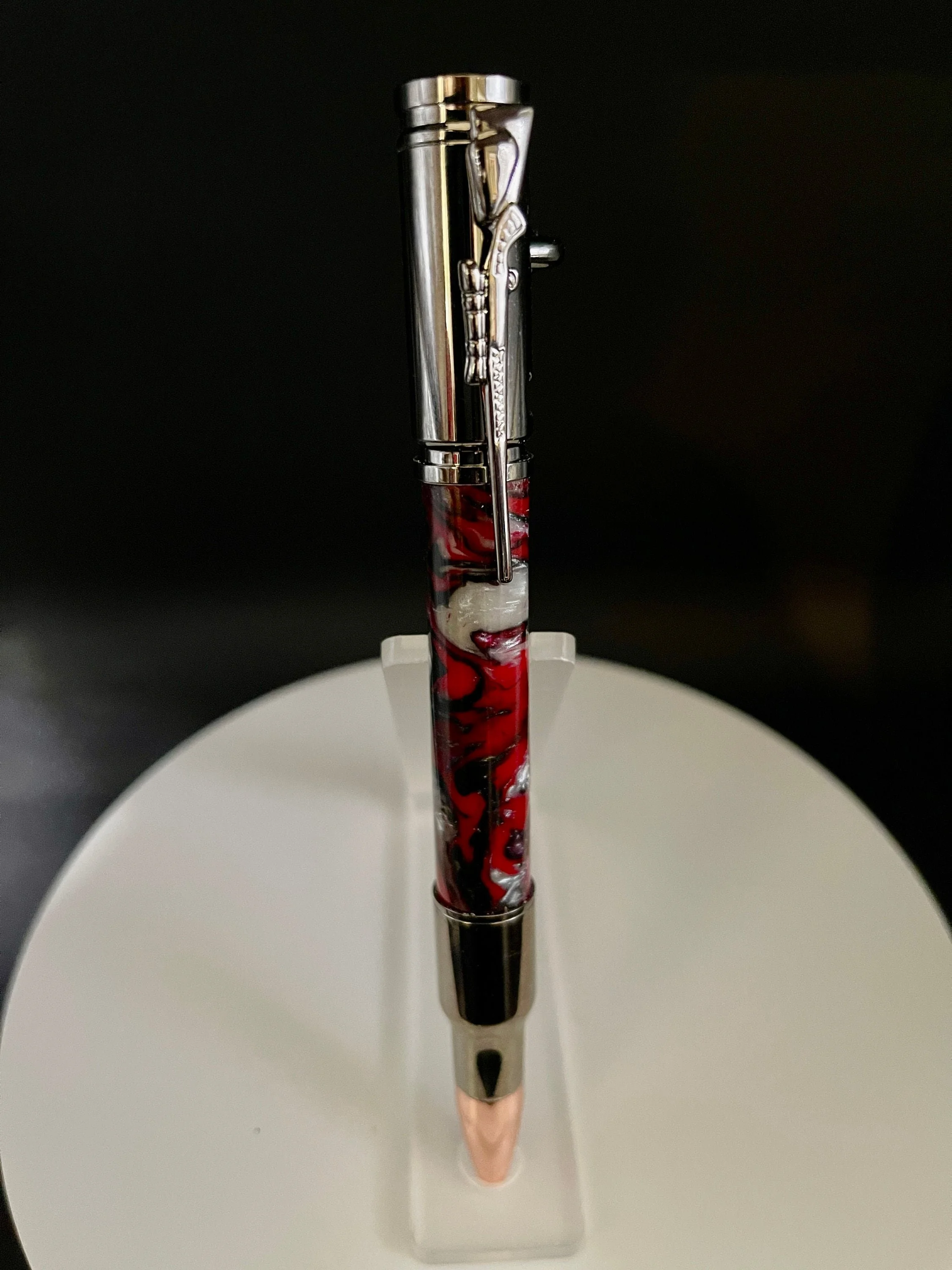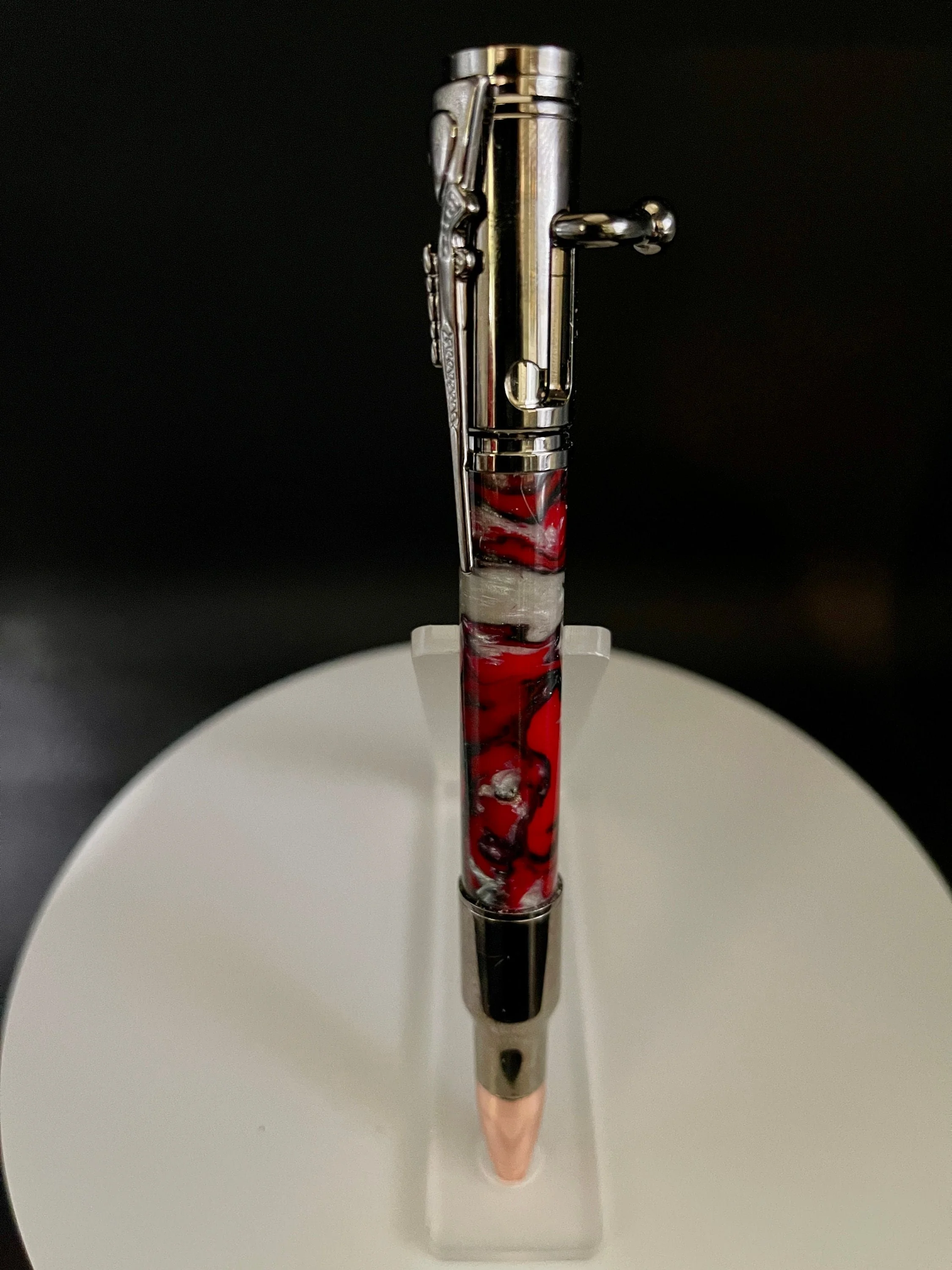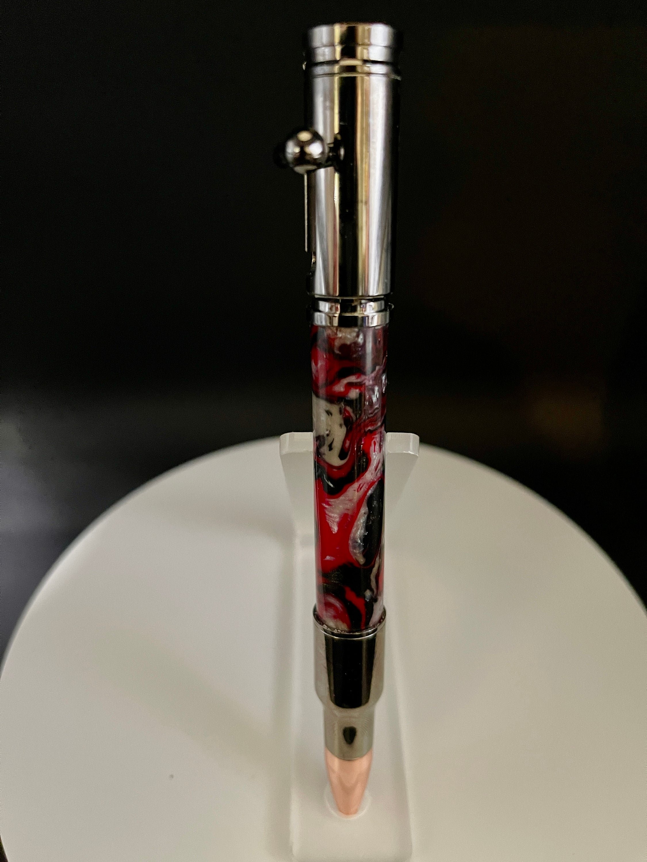 A fun Bolt Action pen that will be hard for any hunting or target-shooting enthusiast to put down. The realistic bolt-action handle smoothly advances and retracts to securely lock the refill in place. Includes a bolt action rifle clip and a replica 30 caliber cartridge and rose gold bullet tip for added authenticity. Uses a Parker Refill. Makes for a wonderful Valentine's gift, Christmas Gift, Birthday gift, Wedding Gift(GroomsMen), Custom Gift, One of a Kind gift, Retirement gift, Mother's Day gift, Father's Day gift.