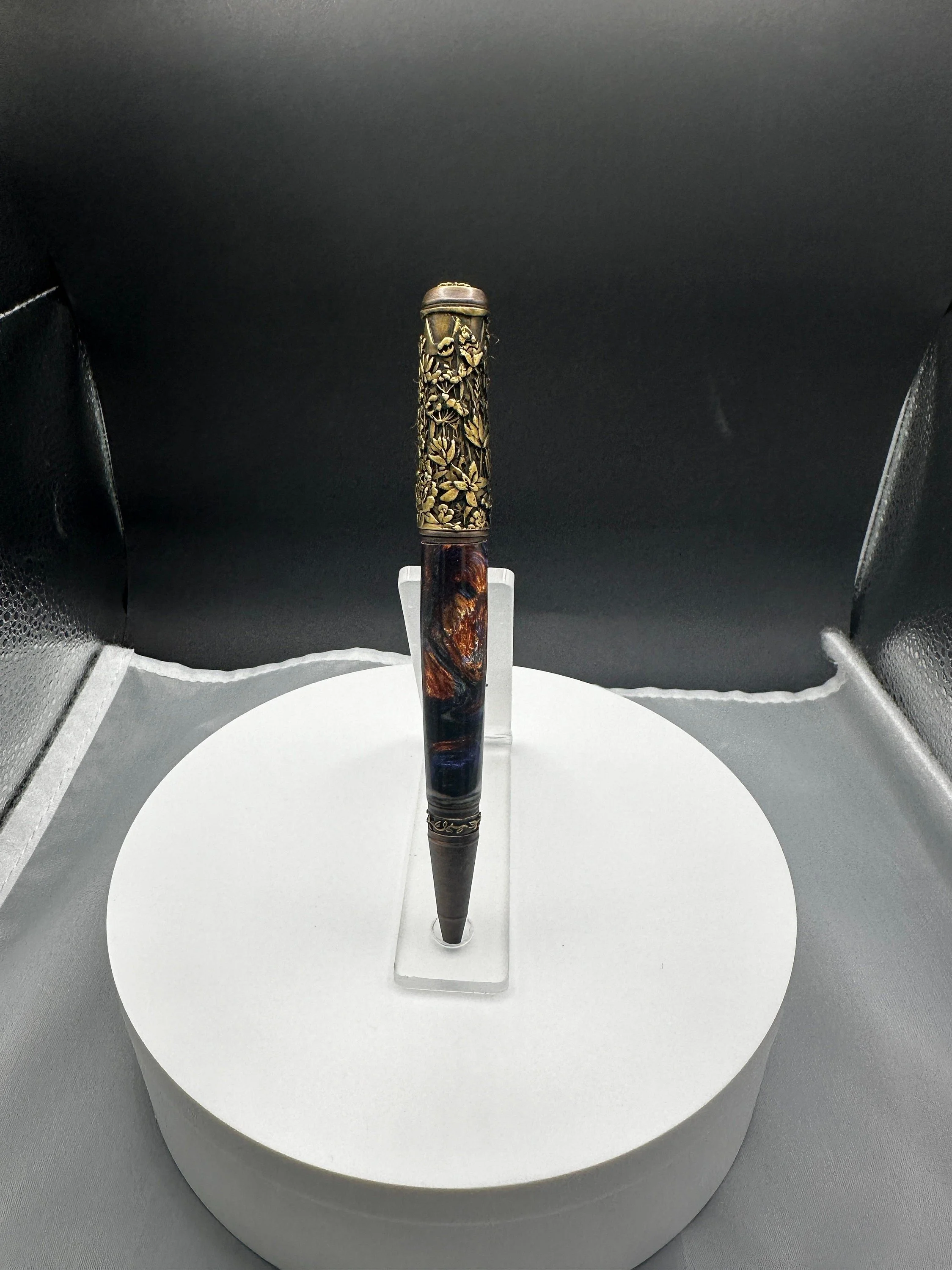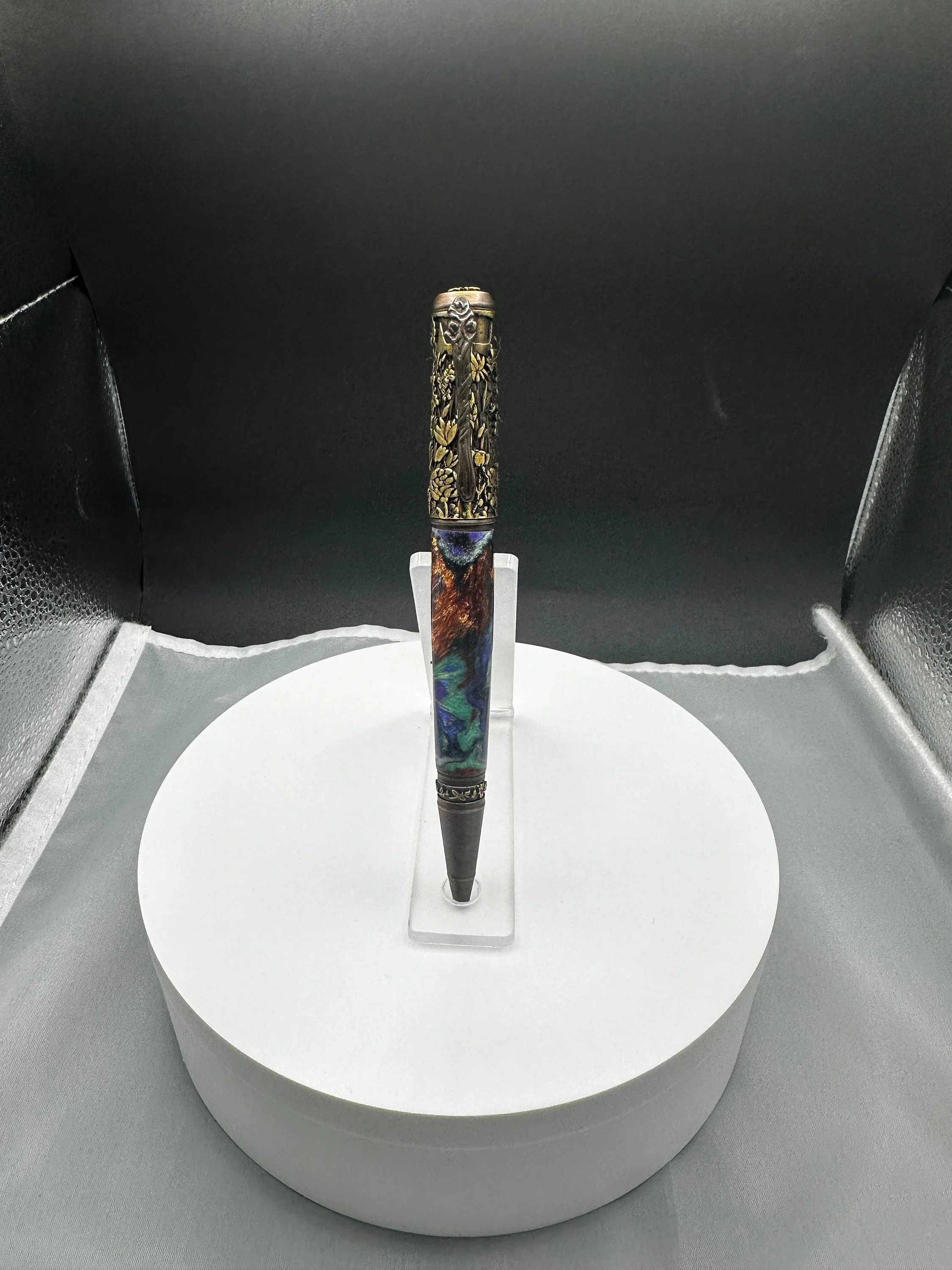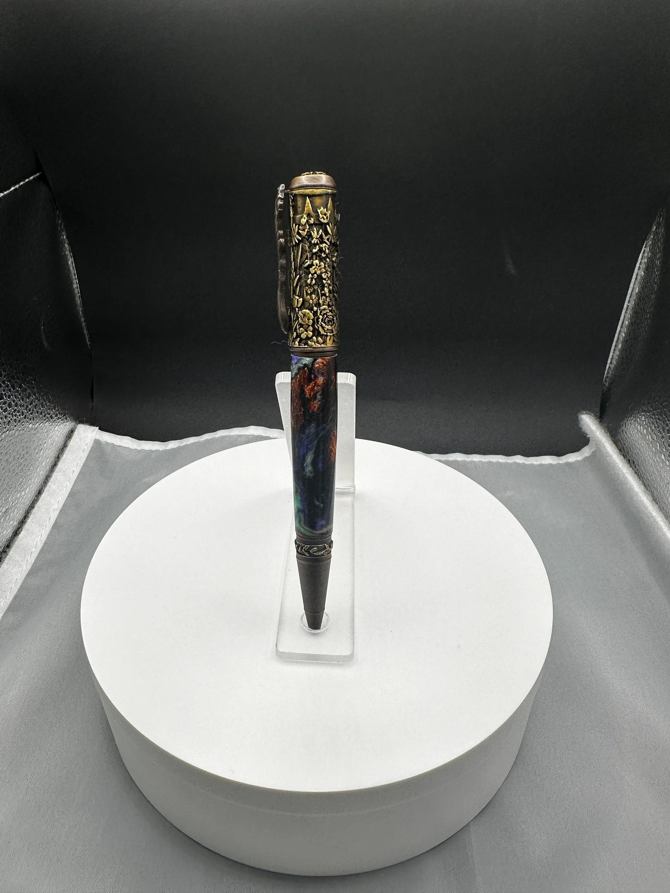 Unique hand-turned Resin. A Pen for lovers of flowers and all things botanical. The design combines a variety of natural elements from gardens and wildflowers as if growing from the pen itself to create the ultimate celebration of the botanical world around us. Exquisitely casted in intricate detail. On the pen end you will find wildflowers and grasses, with bugs and butterflies mixed within. The pen clip overlays the backend with similar flowers as if to pop-out from the pen end. The pen top includes a bursting bloom while the pen tip's wondering vine band adds another charming layer to the pen. Includes a smooth writing Parker style refill.