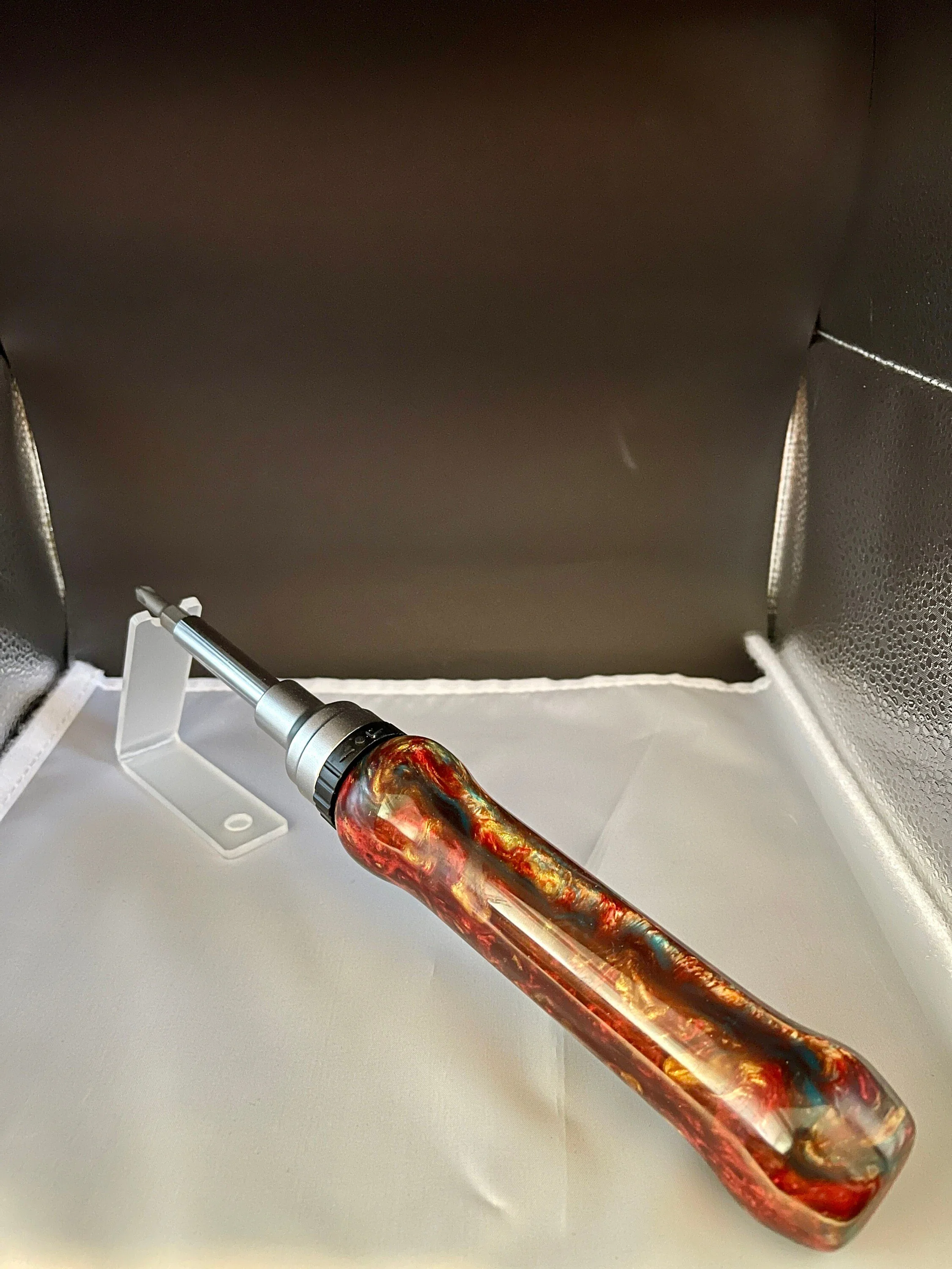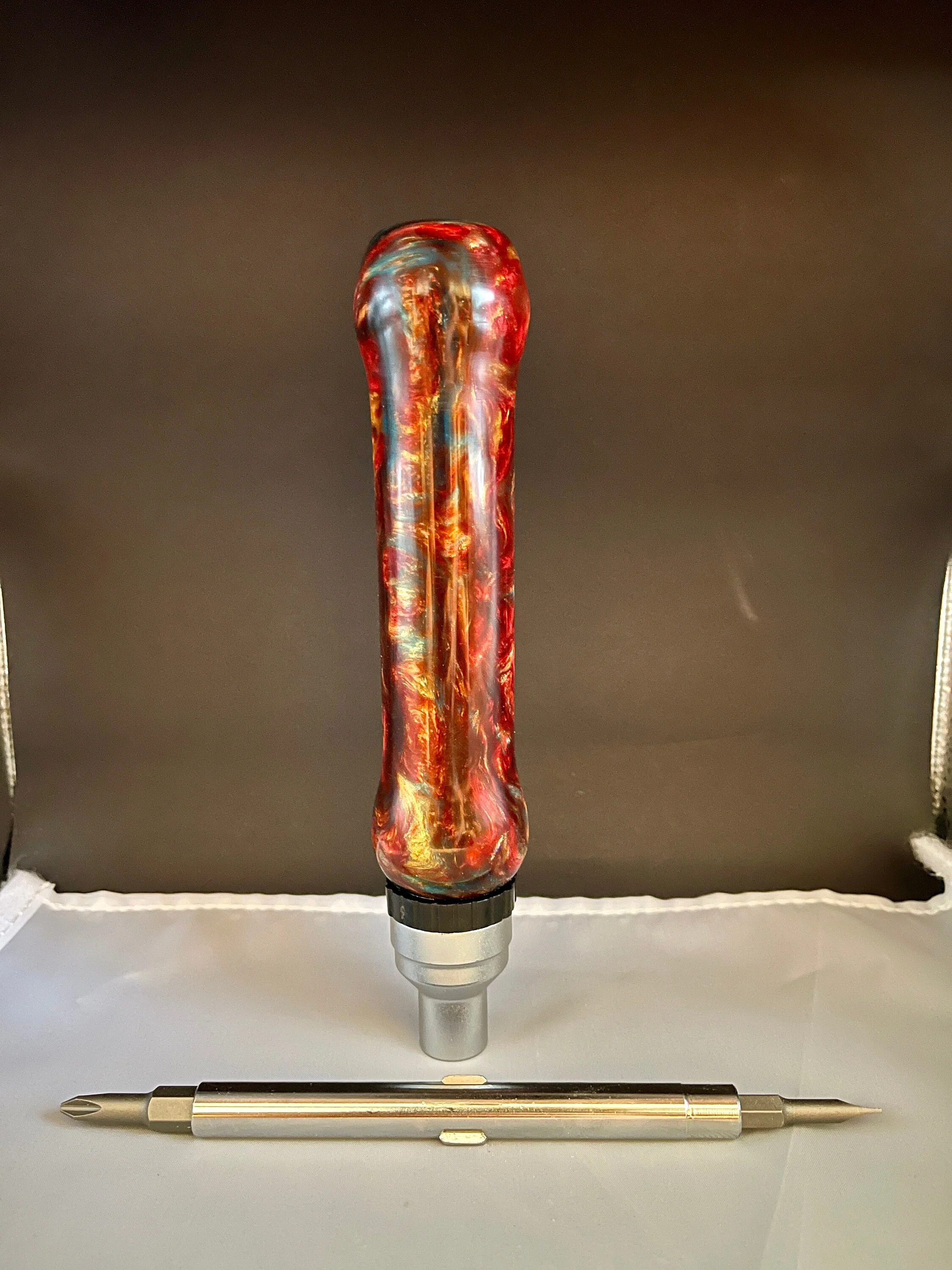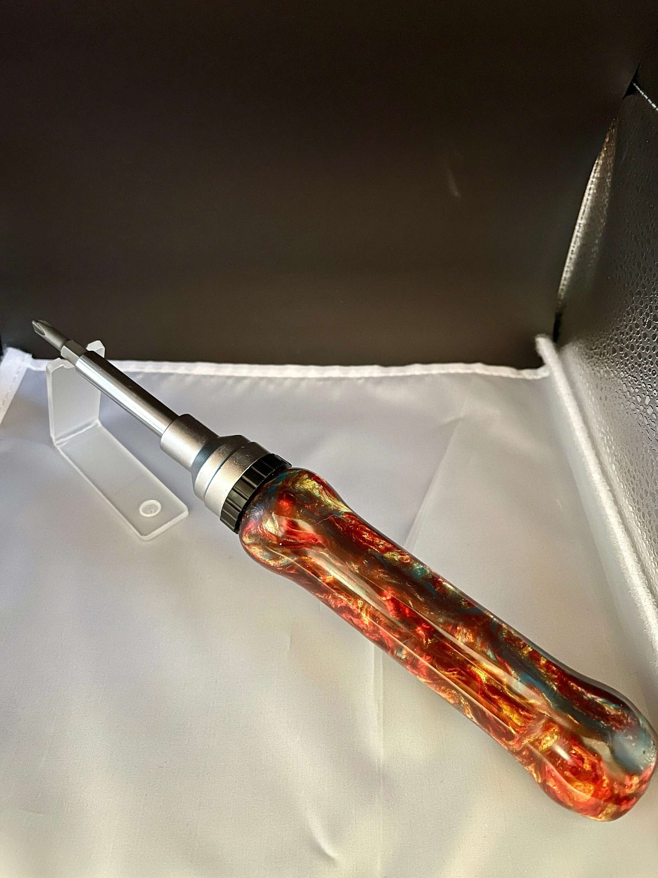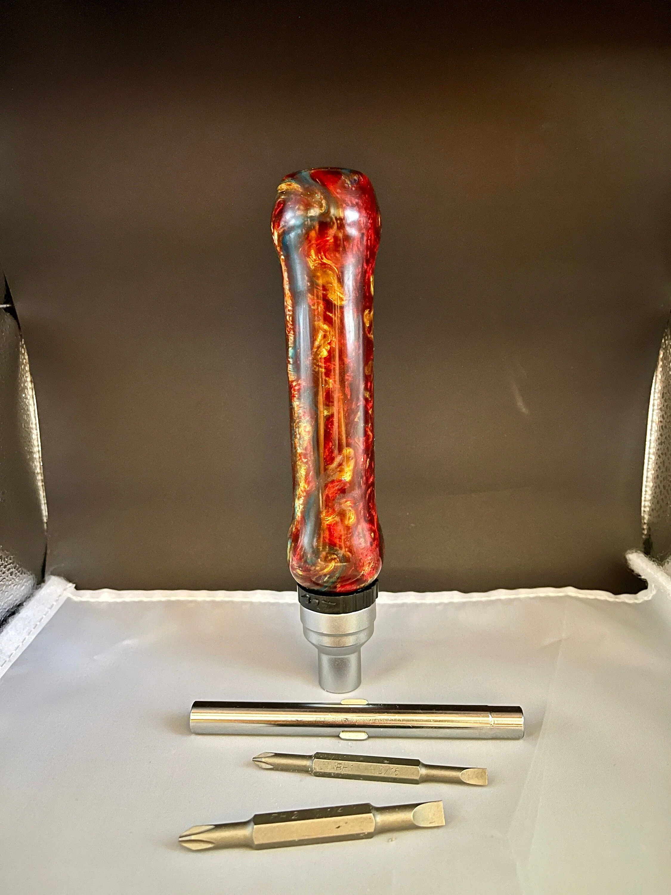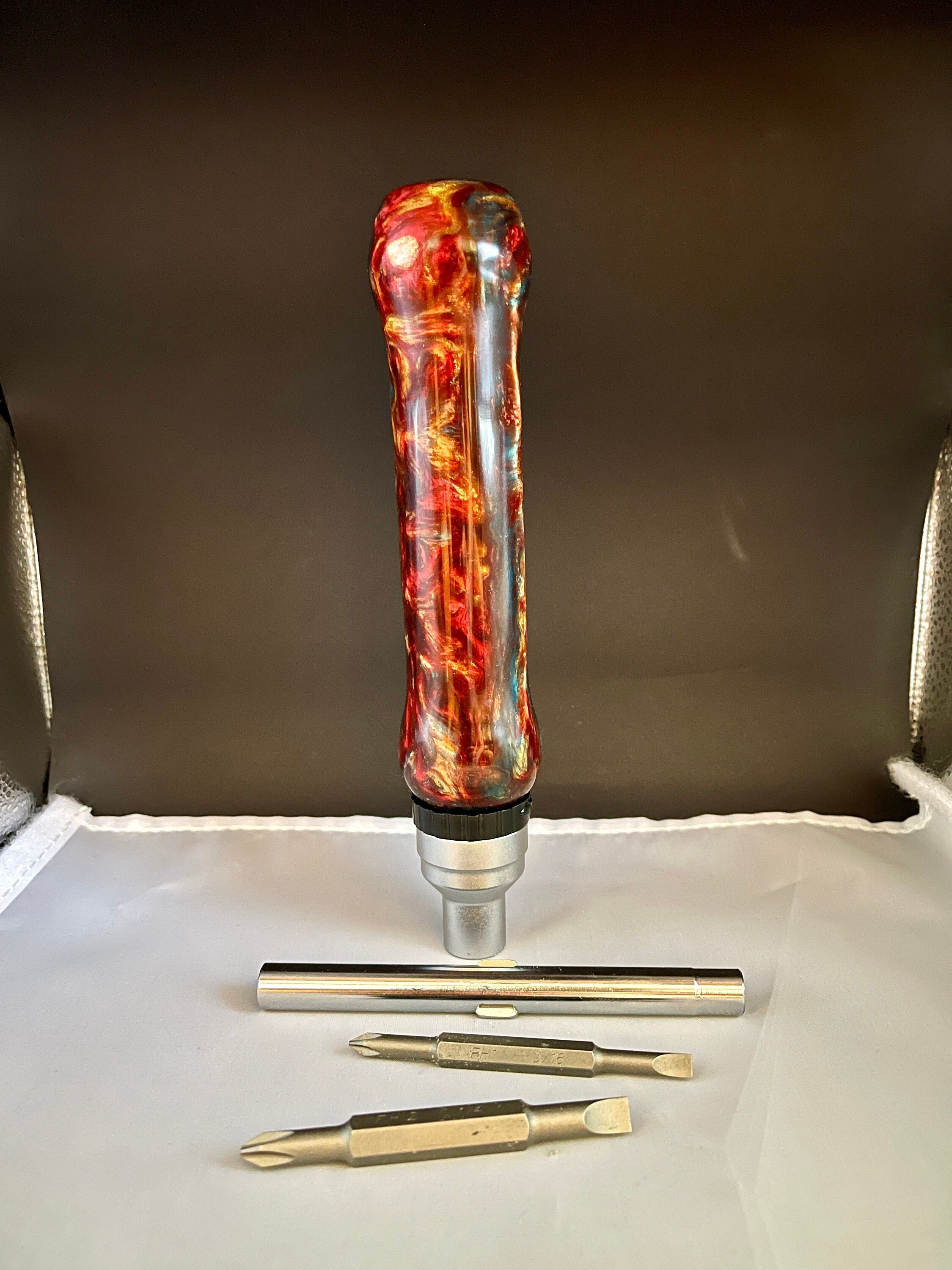 Unique hand-turned ratchet screw driver. 7 function set includes: 2 reversible PH 2 bits (4 functions), remove the bits and shaft to expose drivers for 1/4", 5/16, and 7/16" hex nuts (3 functions). Makes for a wonderful Valentine's gift, Christmas Gift, Birthday gift, Wedding Gift, Custom Gift, One of a Kind gift, Retirement gift, Mother's Day gift, Father's Day gift.