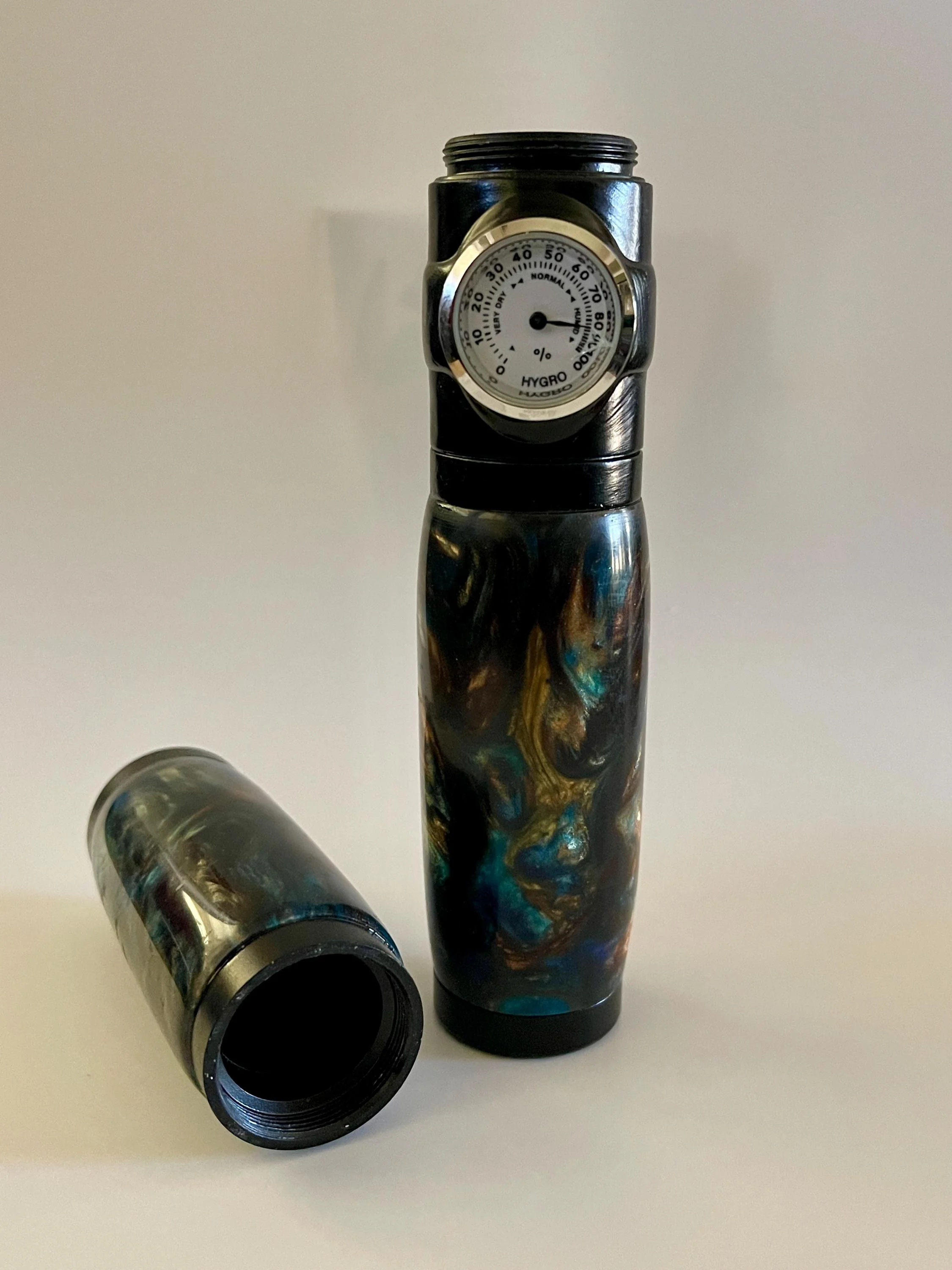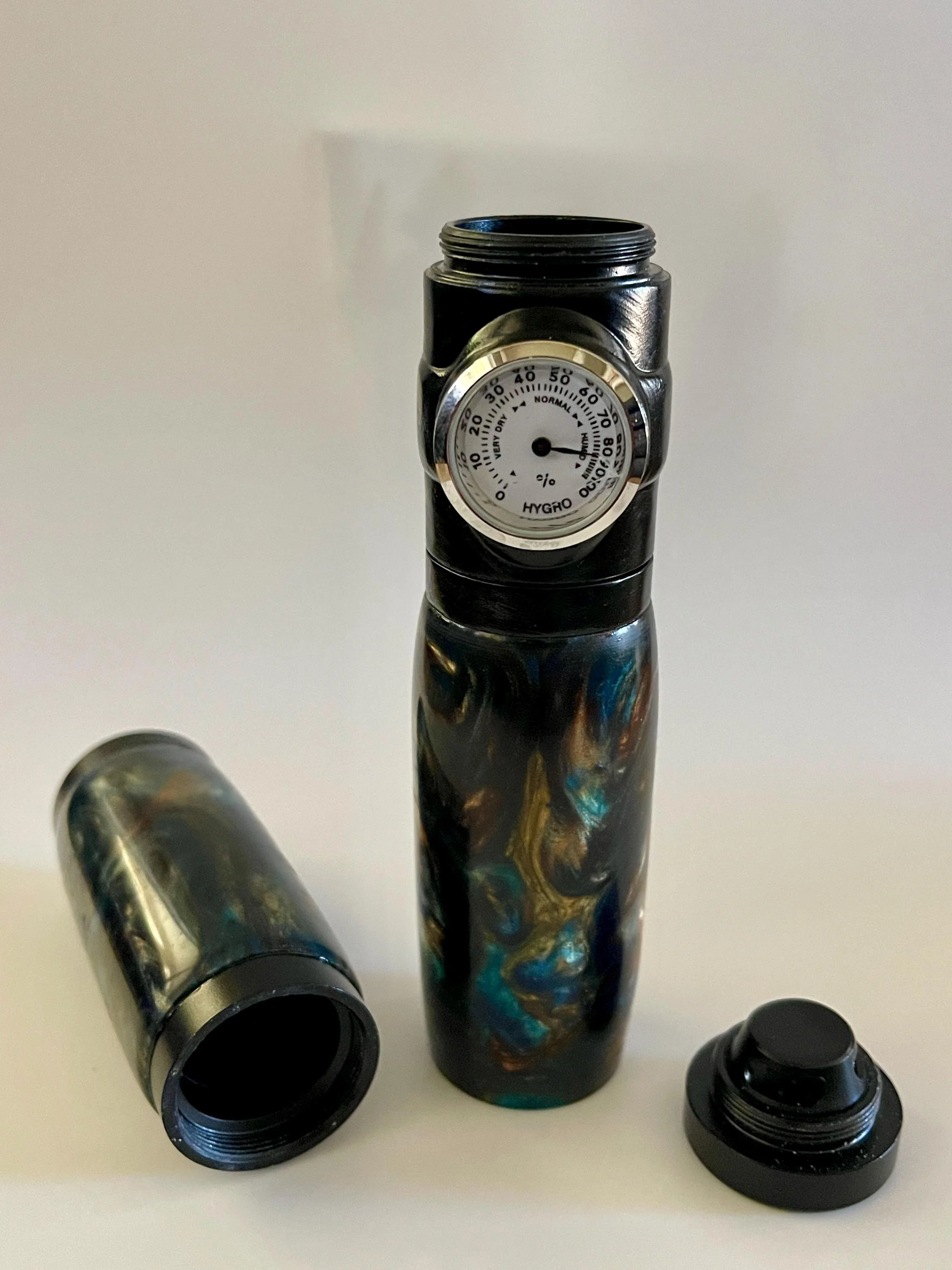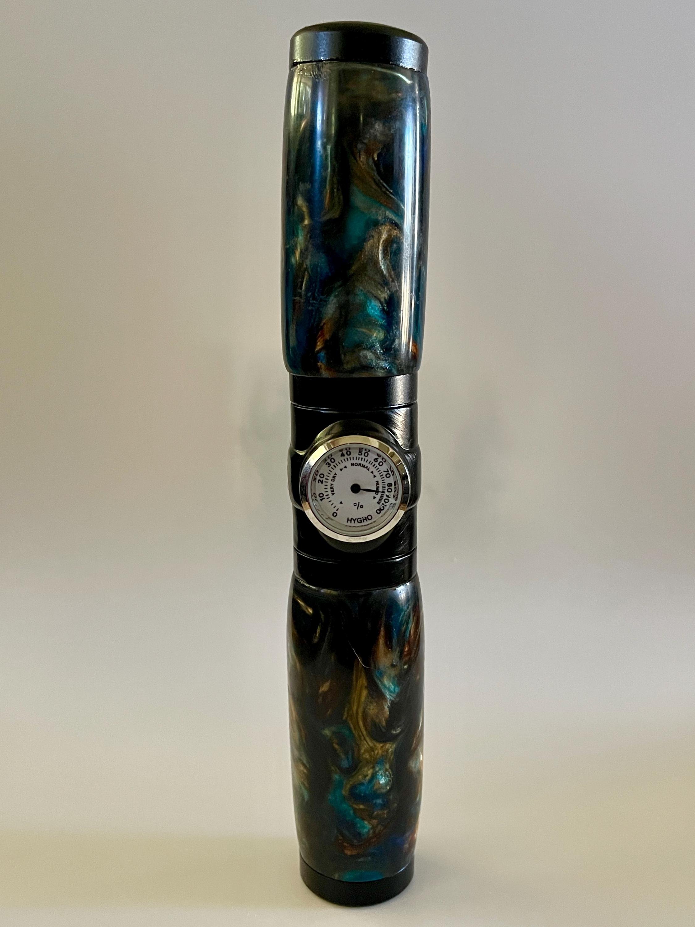 Tubular humidor comes complete with a hygrometer that displays current humidity